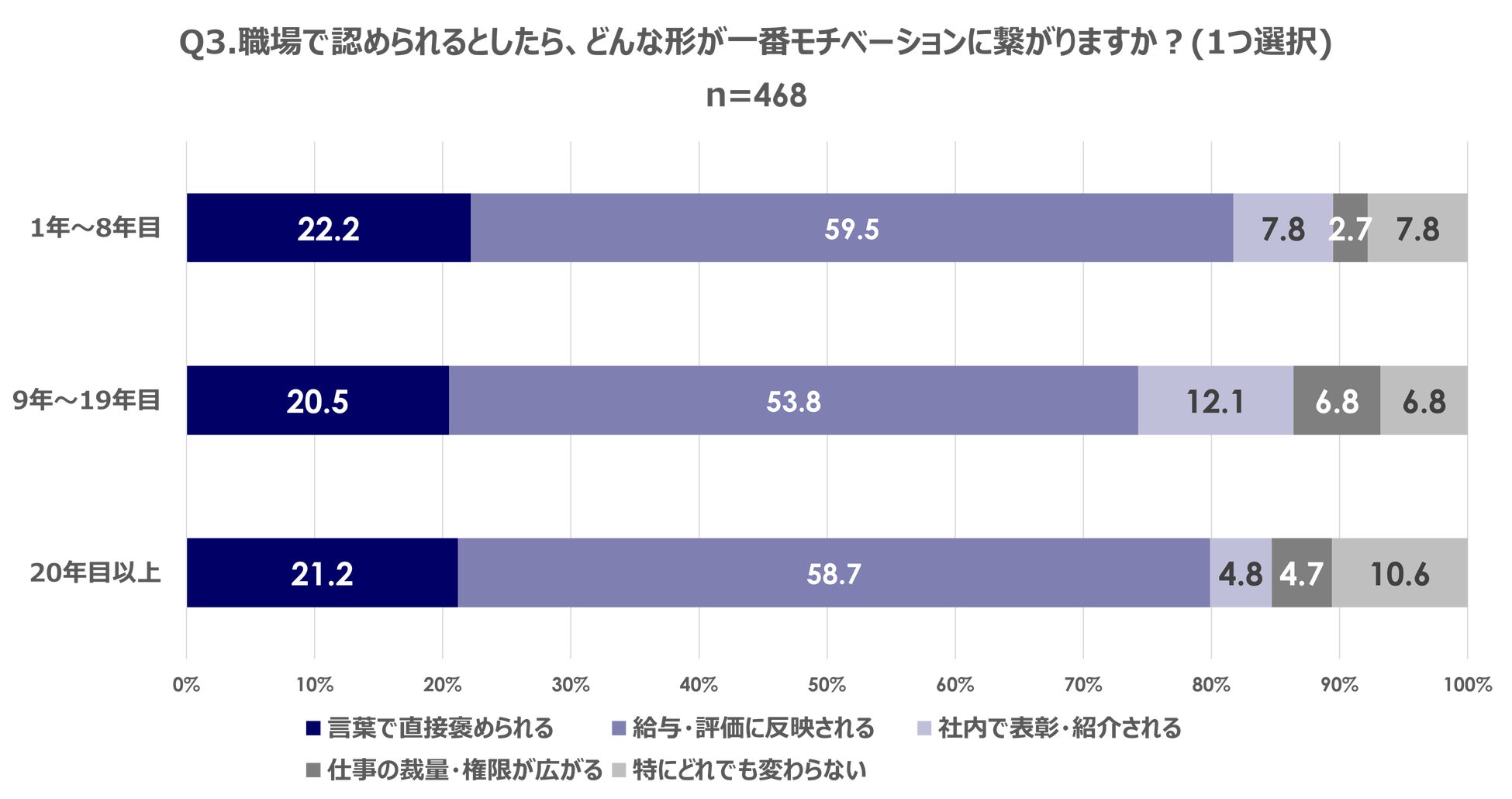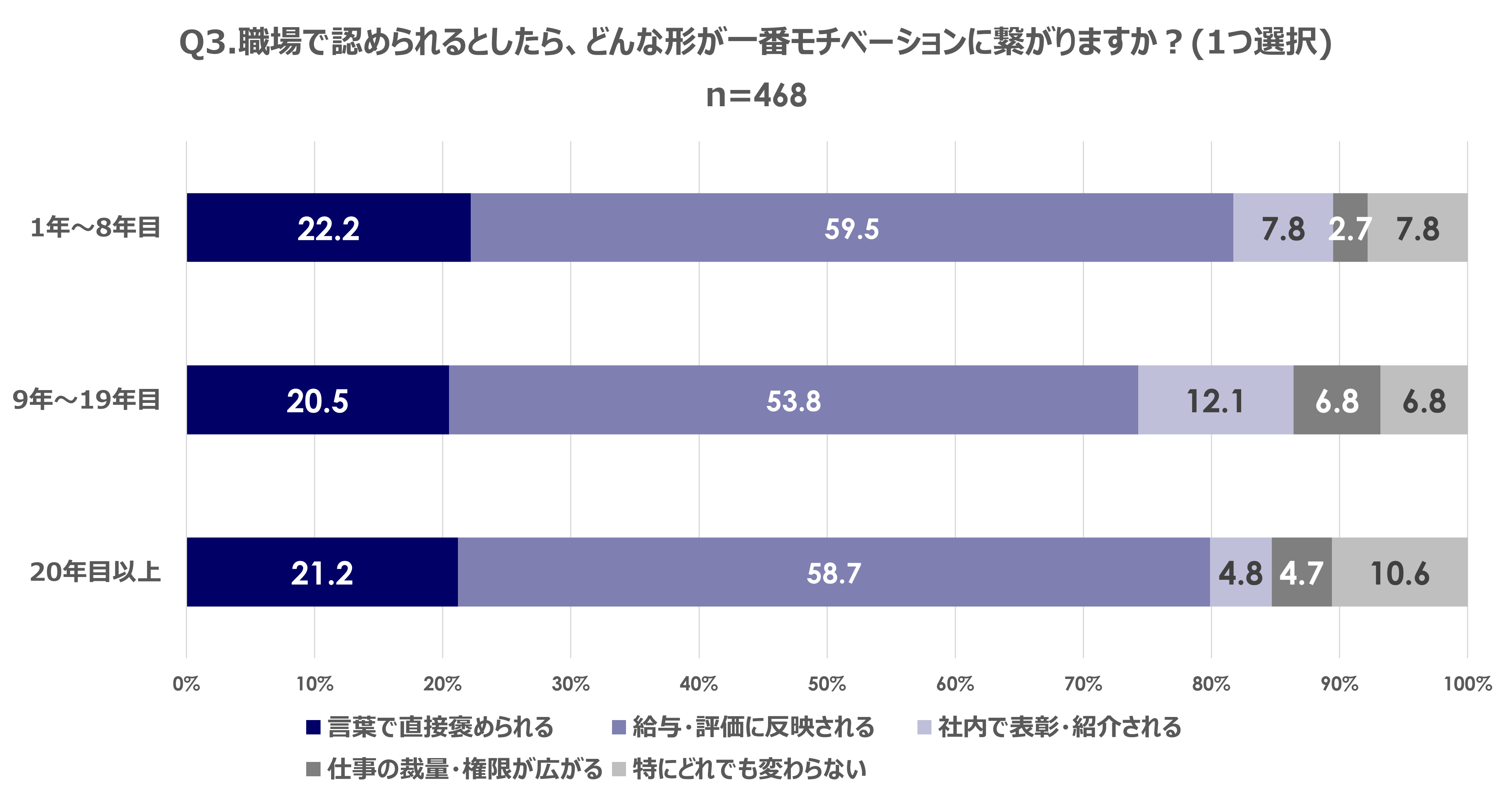 口頭での称賛や社内表彰よりも「給与・評価」という具体的・実質的なリターンを求める傾向は、世代を問わず一致しています。