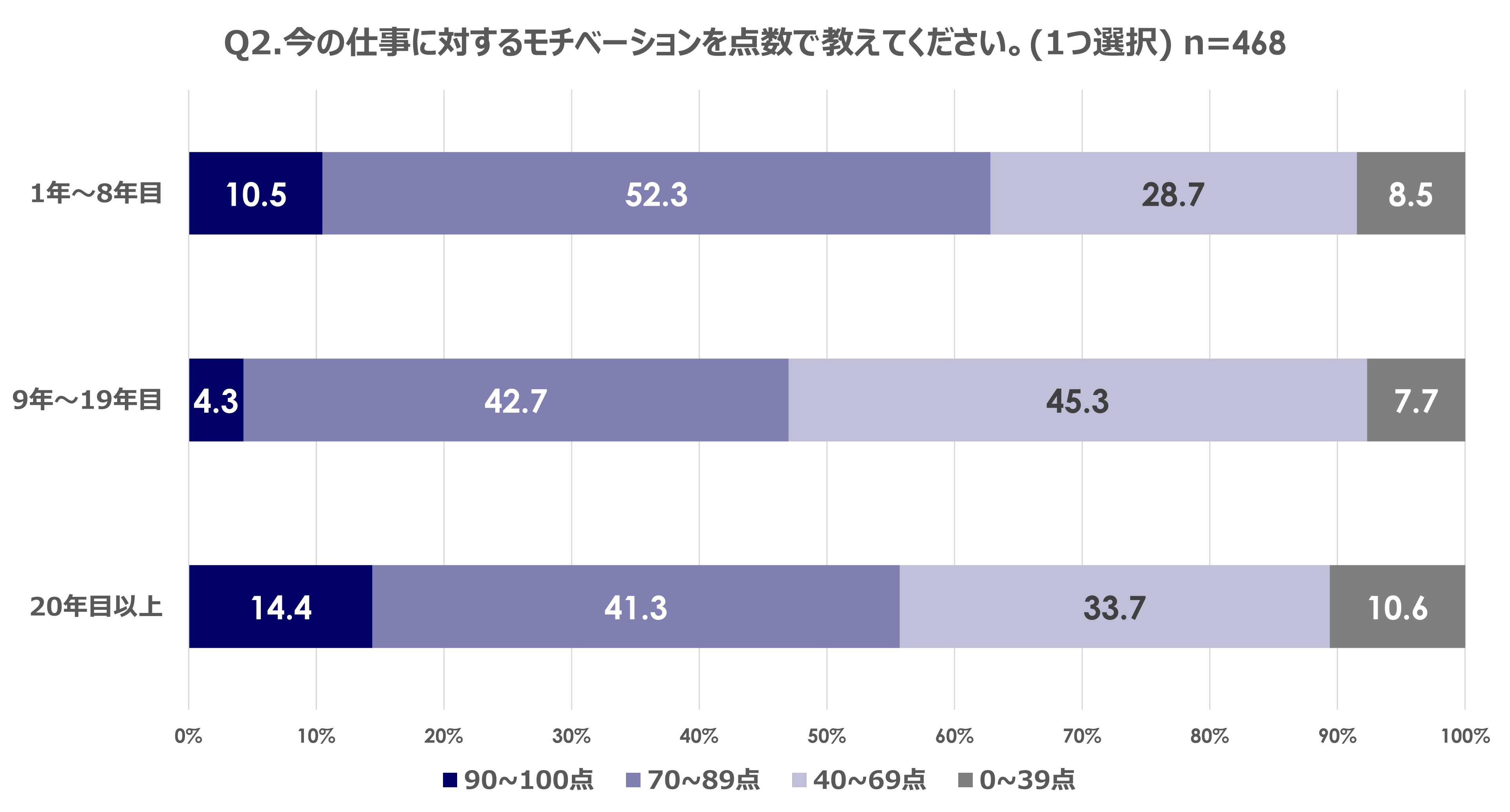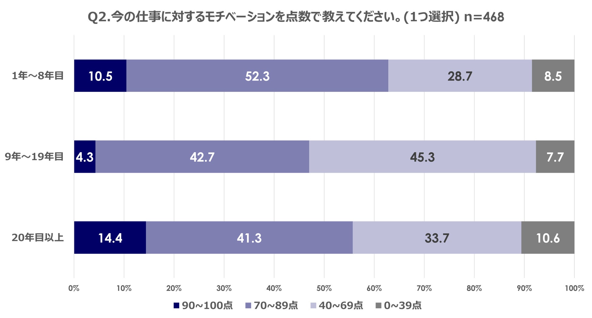 9年~19年目のモチベーション低下は、昇進・昇給の停滞感や、仕事への慣れによる刺激の減少と重なりやすい時期と伺えます。一方で、20年目以上のベテランは、ポジティブ回答が若手に次いで高い結果となりました。