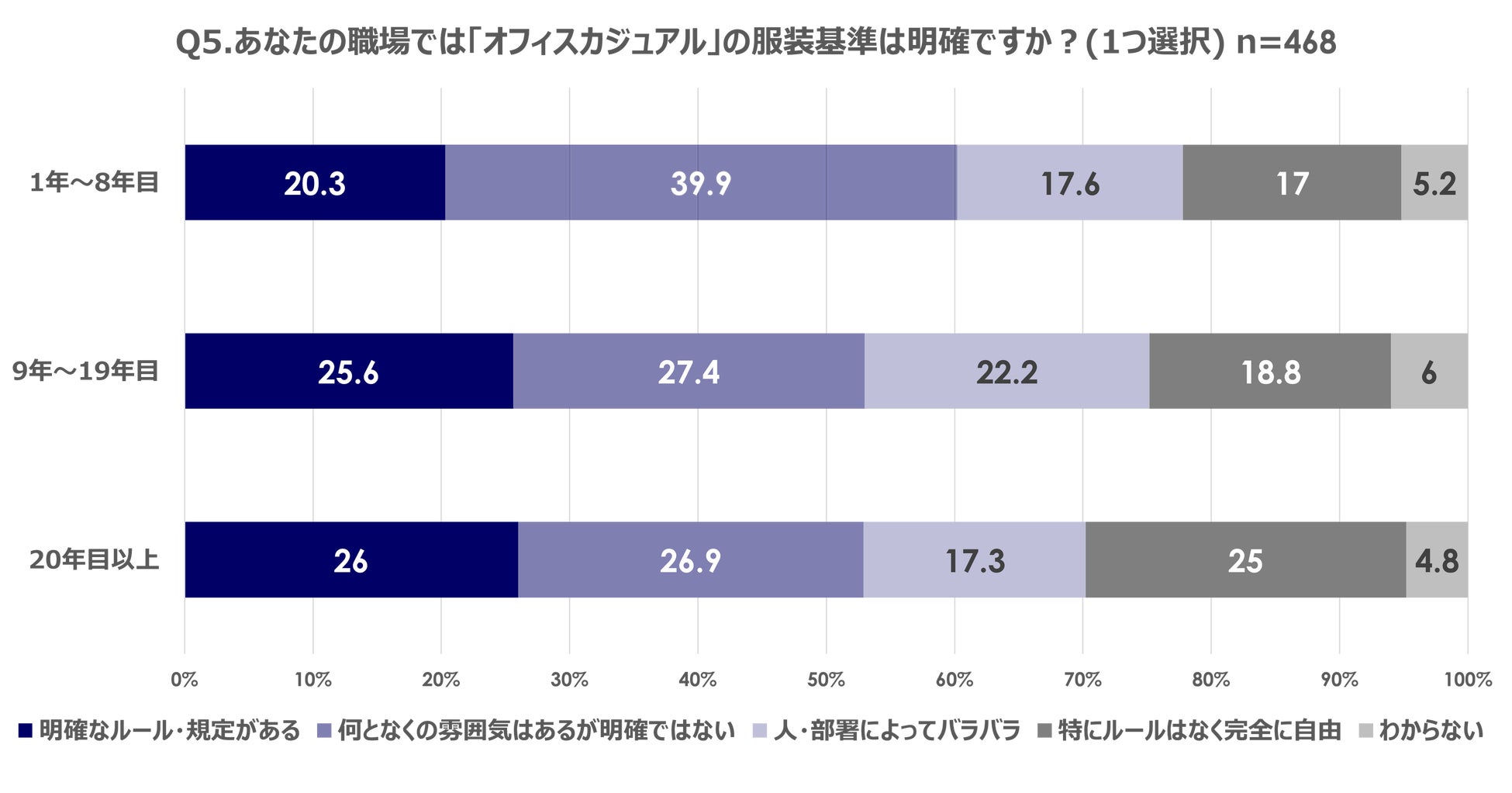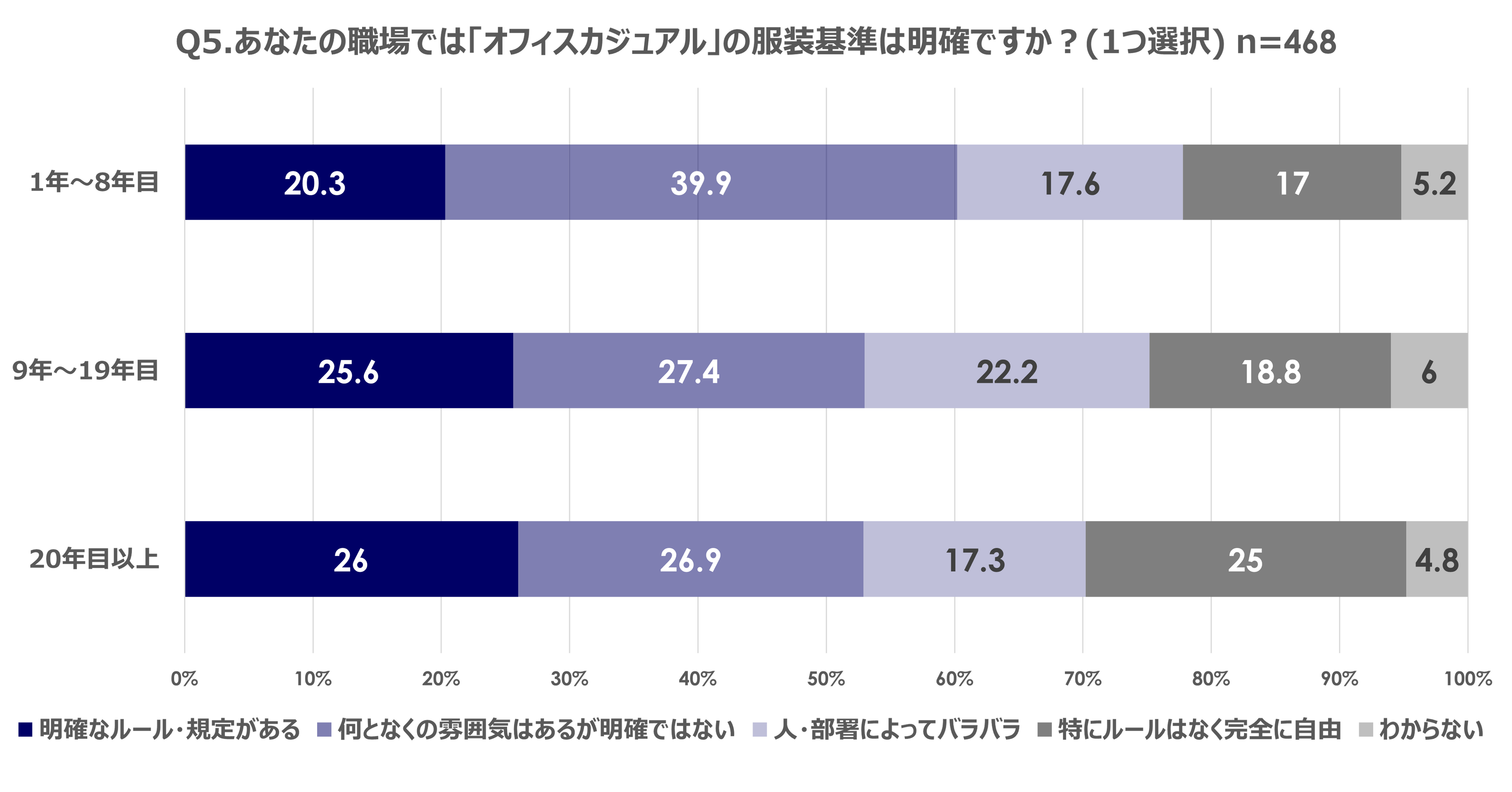 1年~8年目は”何となくの雰囲気はあるが明確ではない”が割合としては多く、一方で20年目以上は”明確なルール・規定がある”と”特にルールはなく完全に自由”が多く、世代によって回答に変化が出た結果となりました。