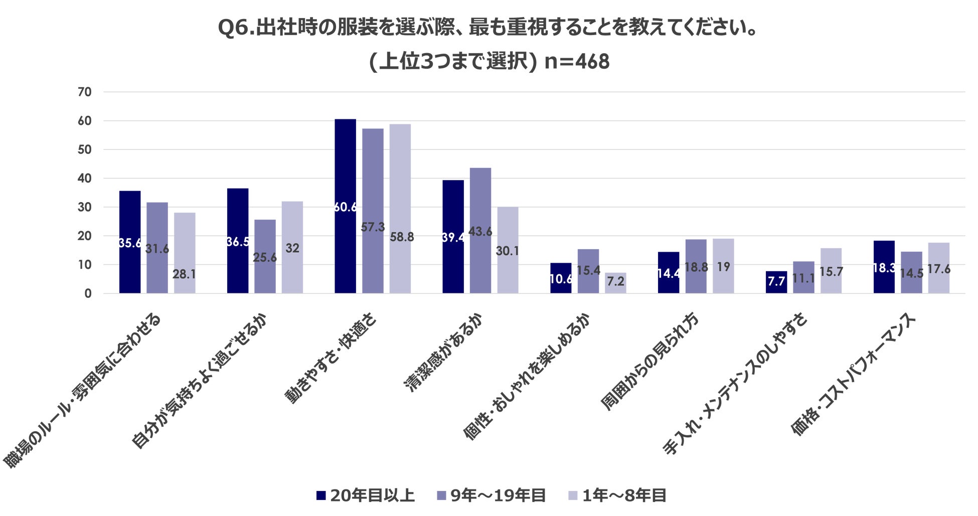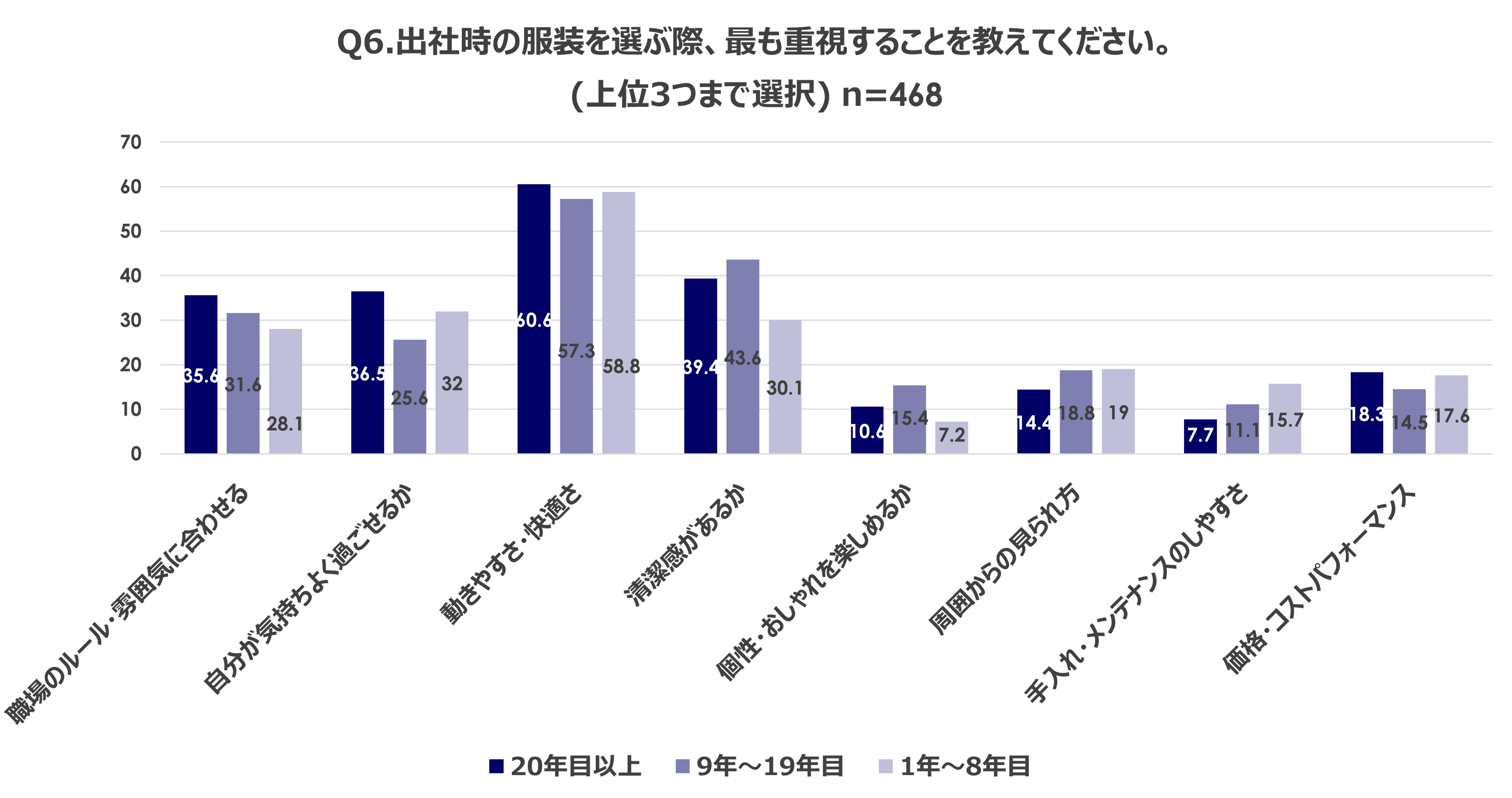服装選びの軸の変化は、仕事に対する自信の成長を映す鏡ともいえます。若手は「周囲やルール」といった他者基準を重視する一方、ベテランは「快適さや自分らしさ」といった自己基準へとシフトしており、年齢とともにその変化が表れていることがわかりました。