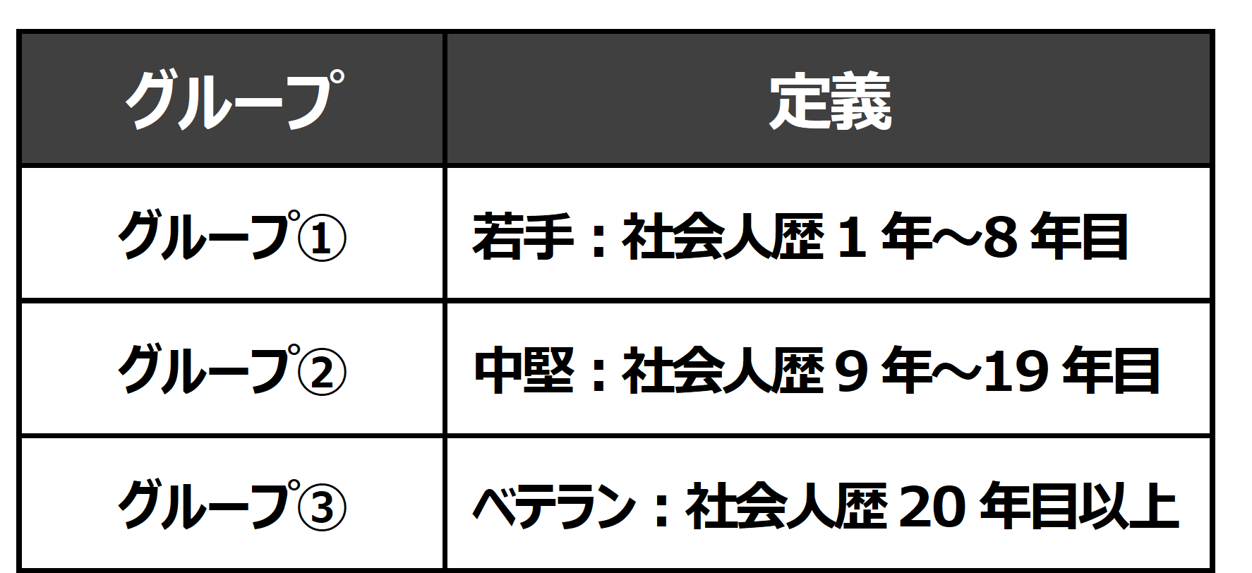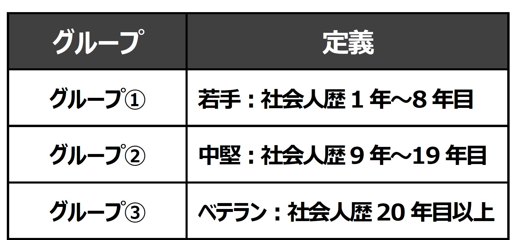 本調査では、現在就業中の正社員・契約社員468名に、社会人経験年数によって「仕事への意識・服装への意識」がどのように変化するかを調査し、回答者を社会人歴に応じて3グループに分類し、比較分析を行いました。
