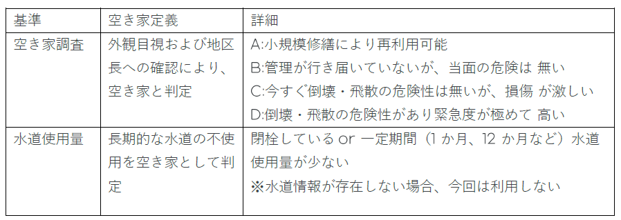 - 突合したリストの水道使用量に基づく空き家判定結果