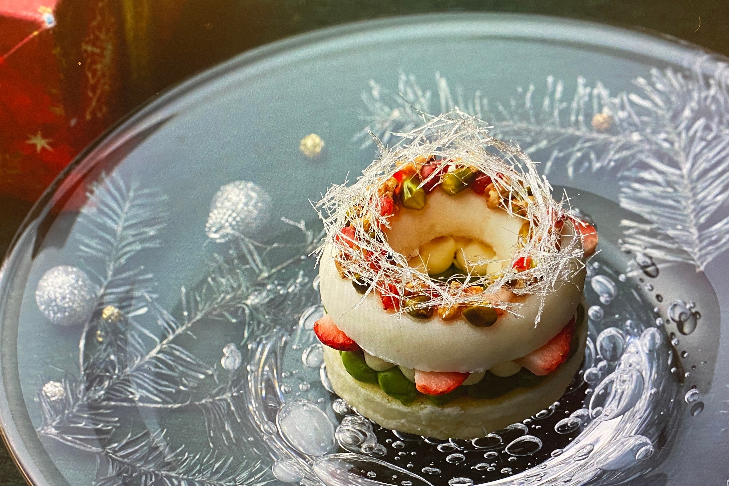 霧氷テラスにある雲Cafeにて、Cloud Pool(クラウドプール)のクリスマスリースをイメージしたドーナツを提供します。ピスタチオや苺をリース状に飾り付け、仕上げに飴細工で霧氷を表現しました。一緒にサンドしているクリームは、ファーム星野(*)の生クリームを使用したクリームチーズと、ピスタチオクリームです。ドーナツの上部のナッツ類はレモン風味のアイシングでコーティングしているため、クリームの濃厚な味わいを感じつつ、さっぱりと食べれます。