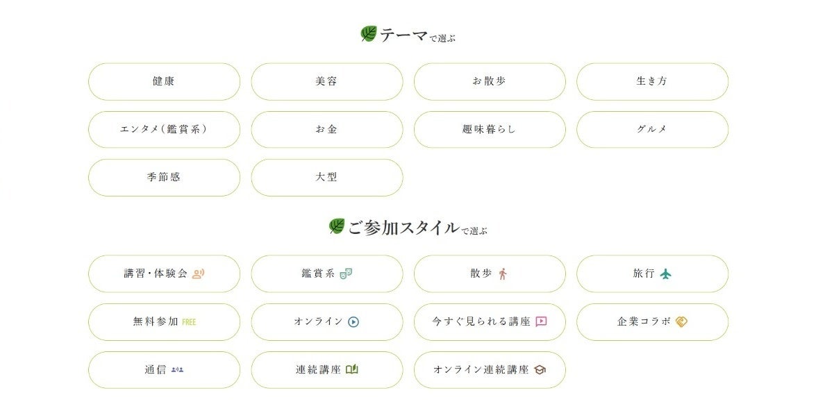 興味やライフスタイルに合わせて、テーマ(美容・健康・グルメ・散歩など)や参加スタイル(体験・鑑賞・オンラインなど)から簡単に検索できます。
