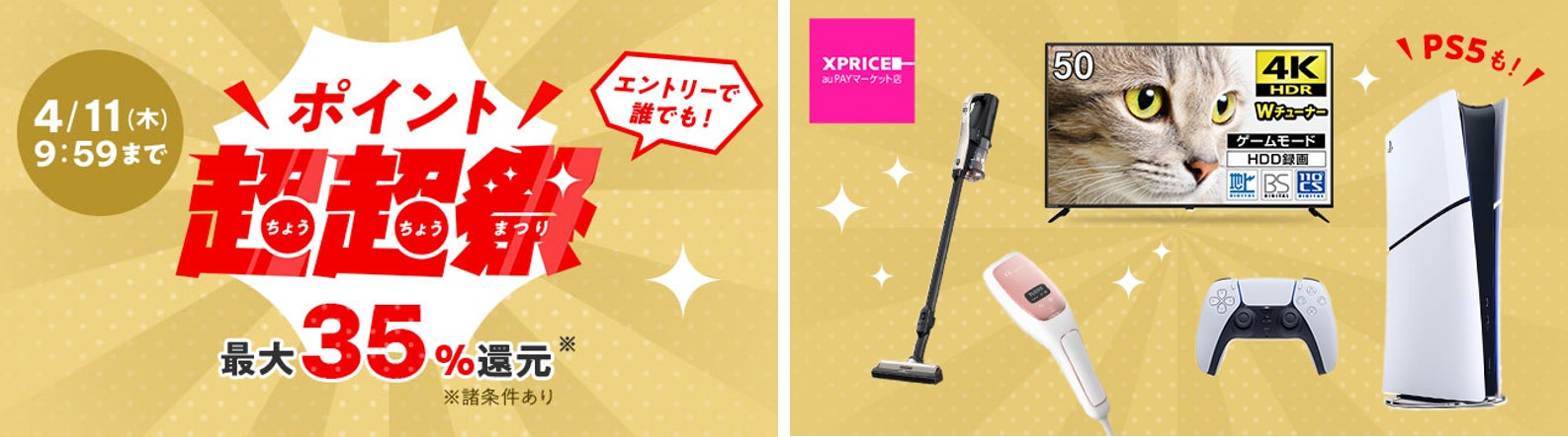 特典内容 | 特典⓵超目玉商品(抽選で50%割引クーポンプレゼント) 【概要】 期間中に、特設サイトから希望する商品の専用エントリークーポンを取得の上、5,000円以上のお買い物をしていただくと、抽選で合計12名さまに目玉商品のお買い物で利用いただける50%割引クーポンをプレゼントします。 【適用条件】 キャンペーン期間中に下記①~③をすべて満たすお客さま ①「au PAY マーケット」で会員登録、またはログインする ②特設サイトから希望する商品の専用エントリークーポンを取得いただくこと ③ XPRICE au PAY マーケット店で5,000円以上ご購入いただくこと そのほか詳細や条件については、(https://plus.wowma.jp/user/15435900/plus/special/cpn/202404/)をご確認ください。 【当選人数】 合計12名 (内訳) PlayStation 5 本体:3名 MAXZEN液晶テレビ本体50型:3名 日立コードレス掃除機:3名 OPUS BEAUTY 03光学脱毛器:3名 特典②ポイント還元 XPRICE au PAY マーケット店内、対象商品のご購入で:最大20%還元 主要対象ブランド:日立、Panasonic、siroca、Electrolux、三菱重工、KARCHER(ケルヒャー)、Hisense、Dyson、MITSUBISHI、富士通ゼネラルなど 特典③特別割引クーポンの配布 【誰でも】 20,000円以上のご購入で利用可能な1,000円割引クーポン そのほか5種の割引クーポンをご用意しています。 【auスマートパスプレミアム会員(有料)】 20,000円以上のご購入で利用可能な1,200円割引クーポン そのほか2種の割引クーポンをご用意しています。 |