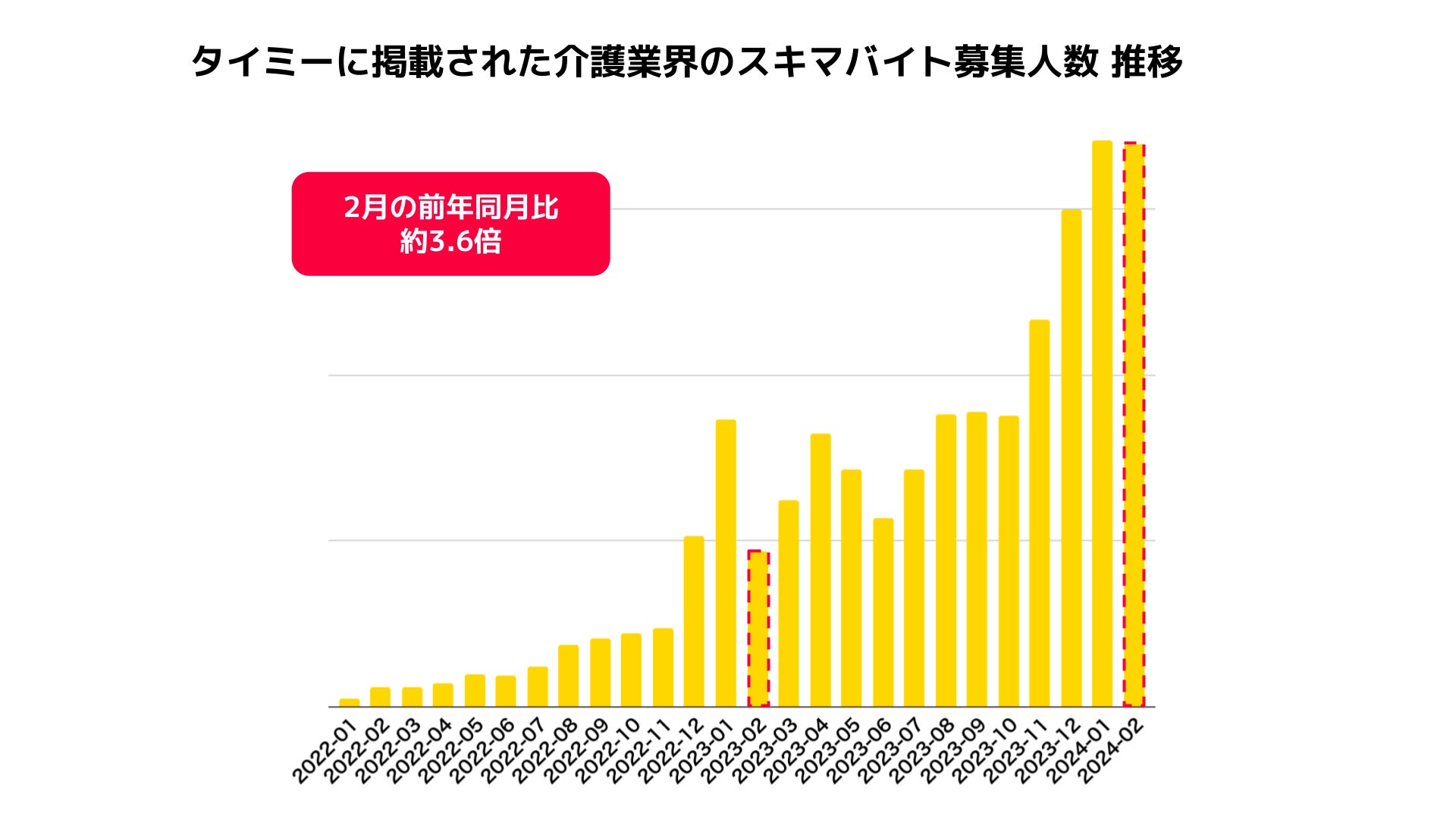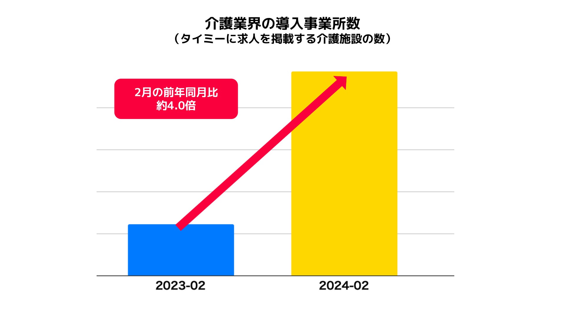 このような中、介護業界でのタイミーのご利用はここ1年で大きく広がり、タイミーに掲載された介護業界の募集人数(2024年2月時点)は前年同月比約3.6倍、導入事業所数は約4.0倍に拡大しました。