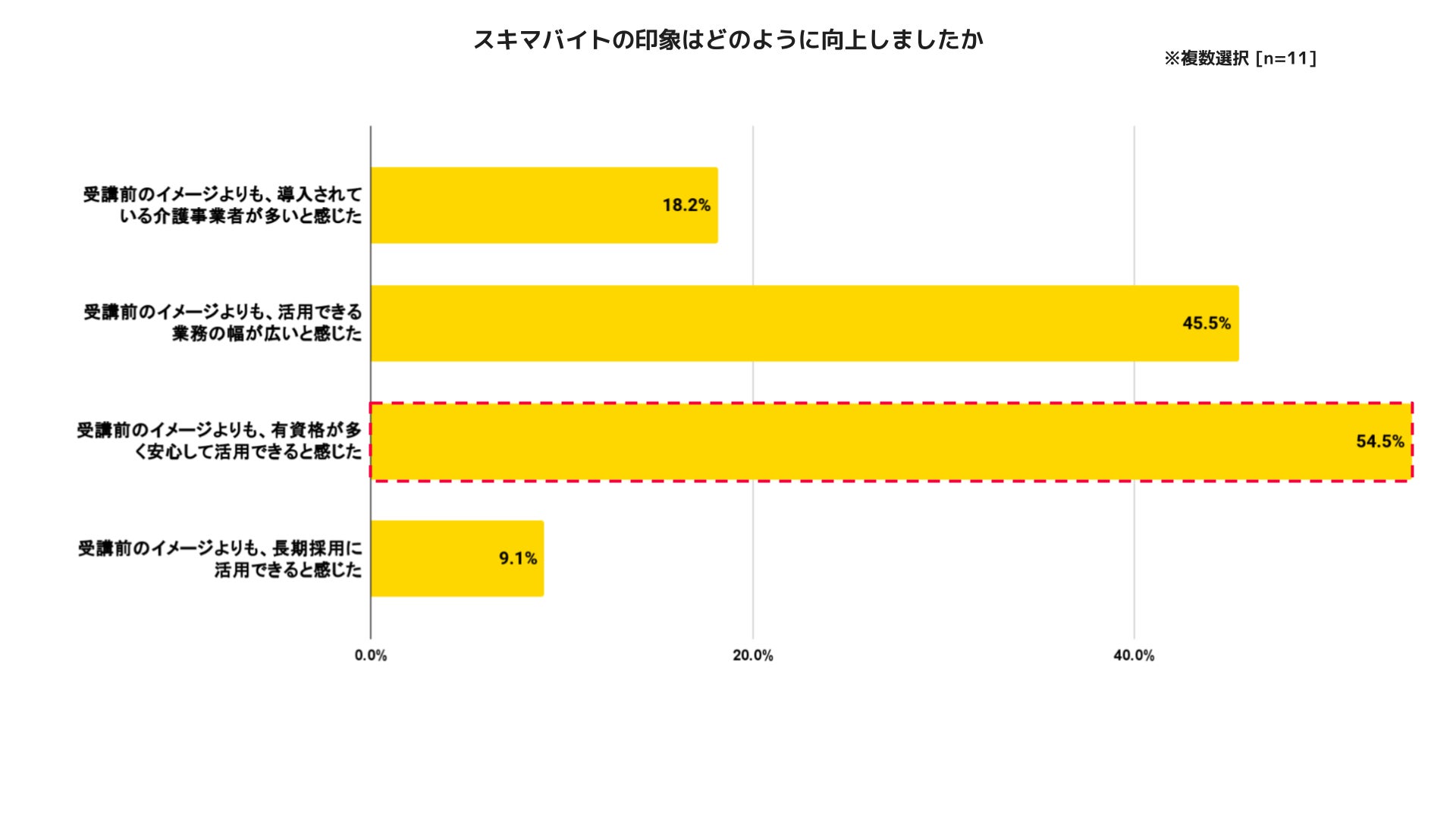 タイミーの介護専門チームは、2024年2月13日に介護事業者向けのスキマバイト活用セミナーを大阪で開催しました。受講後アンケートでは、参加事業者のうち約77%が「受講後にスキマバイトの印象が向上した」と回答。向上した内容は「受講前のイメージよりも、有資格が多く安心して活用できると感じた(54.5%)」が最多で、介護有資格者が豊富なことが、安心感に繋がることがわかります。