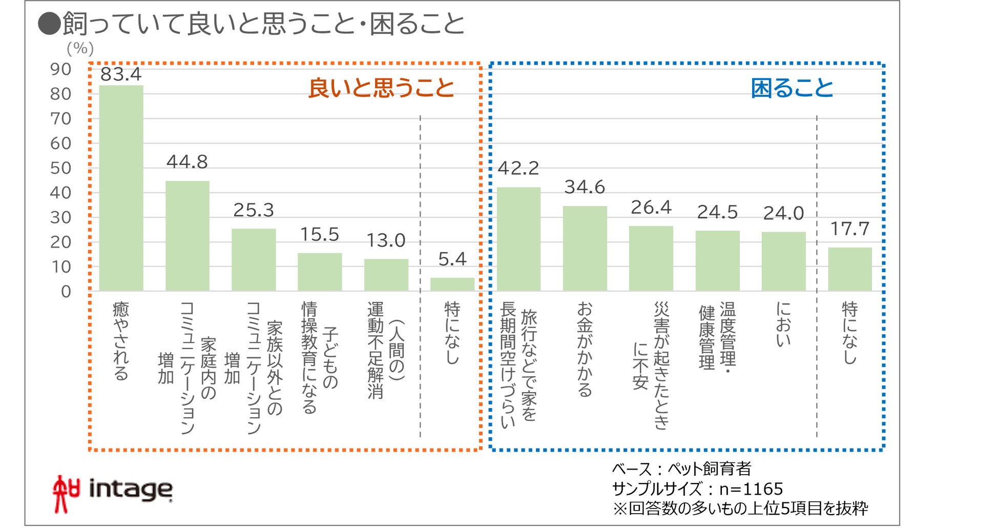 一方、「困ること」は、上位から順に「旅行などで家を長期間空けづらい」(42.2%)、「お金がかかる」(34.6%)、「災害が起きたときに不安」(26.4%)。情緒や人との繋がりに関する項目が目立った「良いと思うこと」に対し、こちらはお世話面など物理的な要素が濃く見られました(図表2)。