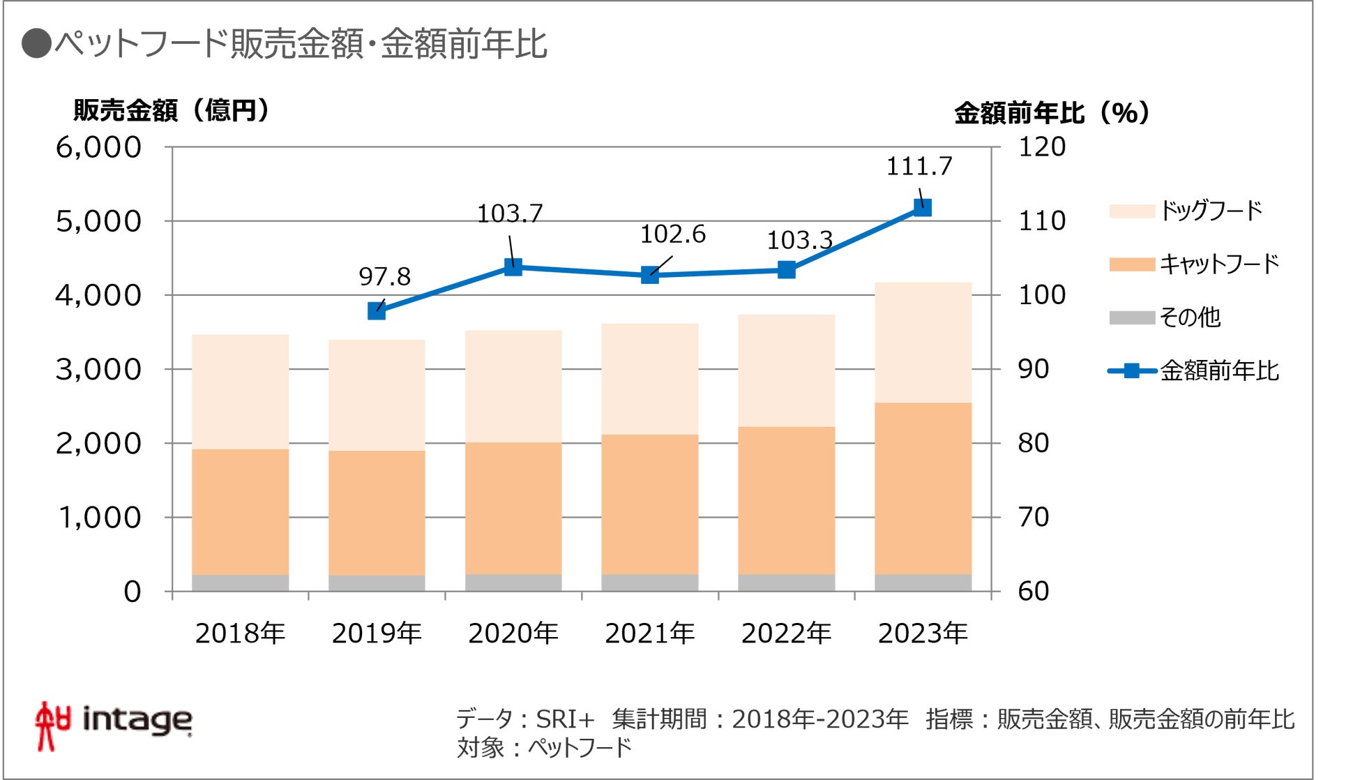 「ペットの食事」に目を転じると、ペットフード全体の市場規模は、値上げの影響もあり2023年においては前年比111.7%です(図表4)。