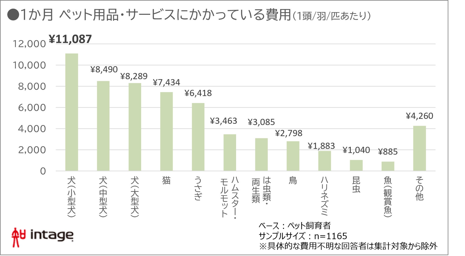 続いて、ペットに関する出費を見てみましょう。図表3は、1か月にペット用品・サービスにかかっている費用を種類別に表したグラフです。最も出費が多いのは「犬(小型犬)」で、11,087円。2位の「犬(中型犬)」(8,490円)を大きく引き離してのトップとなりました。