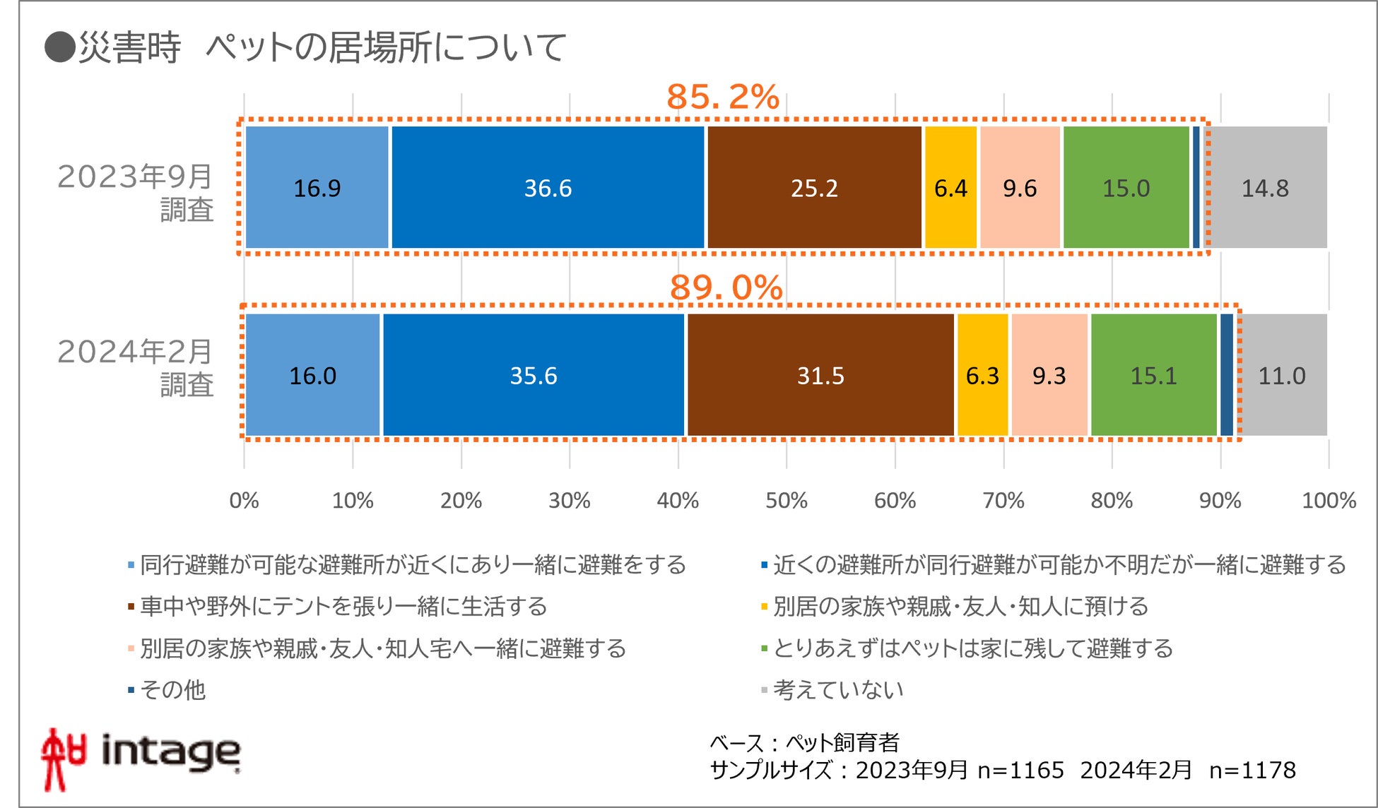 ・災害時のペットの居場所については、「考えている」回答がペット飼育者の89.0%で、昨年8月比で3.8ポイントアップ