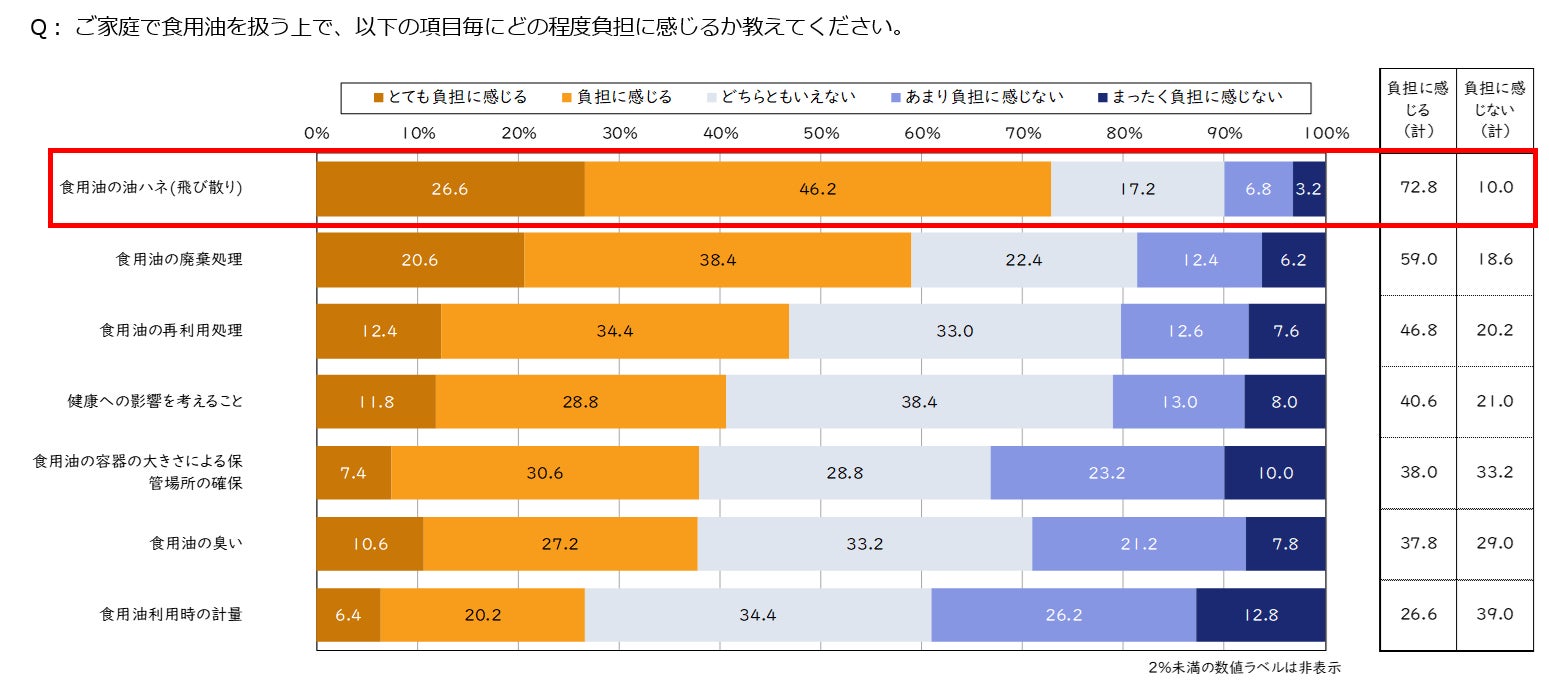 家庭で食用油を扱う上で、最も負担に感じるものは「食用油の油ハネ(飛び散り)」で72.8%、次いで「食用油の廃棄処理」が59.0%でした。
