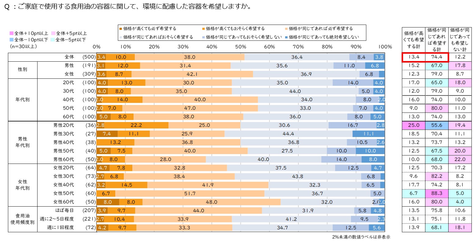 環境配慮容器を「価格が高くても希望する」もしくは「同じであれば希望する」が8割以上、油の正しい捨て方を知っているのは半数