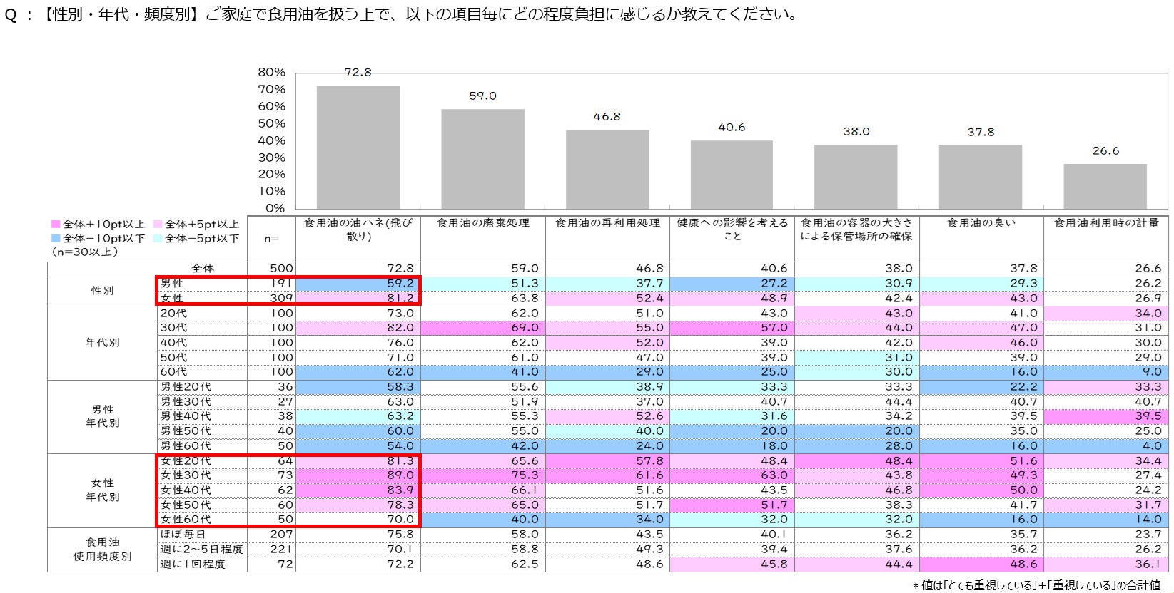 「食用油の油ハネ」の負担を男女で比較すると、女性では81.2%、男性が59.2%と20ポイント以上の差がありました。また、女性20~50代のほぼすべての年代で「食用油の油ハネ」が全体比較で+5~10ポイント以上で負担に感じていることがわかりました。