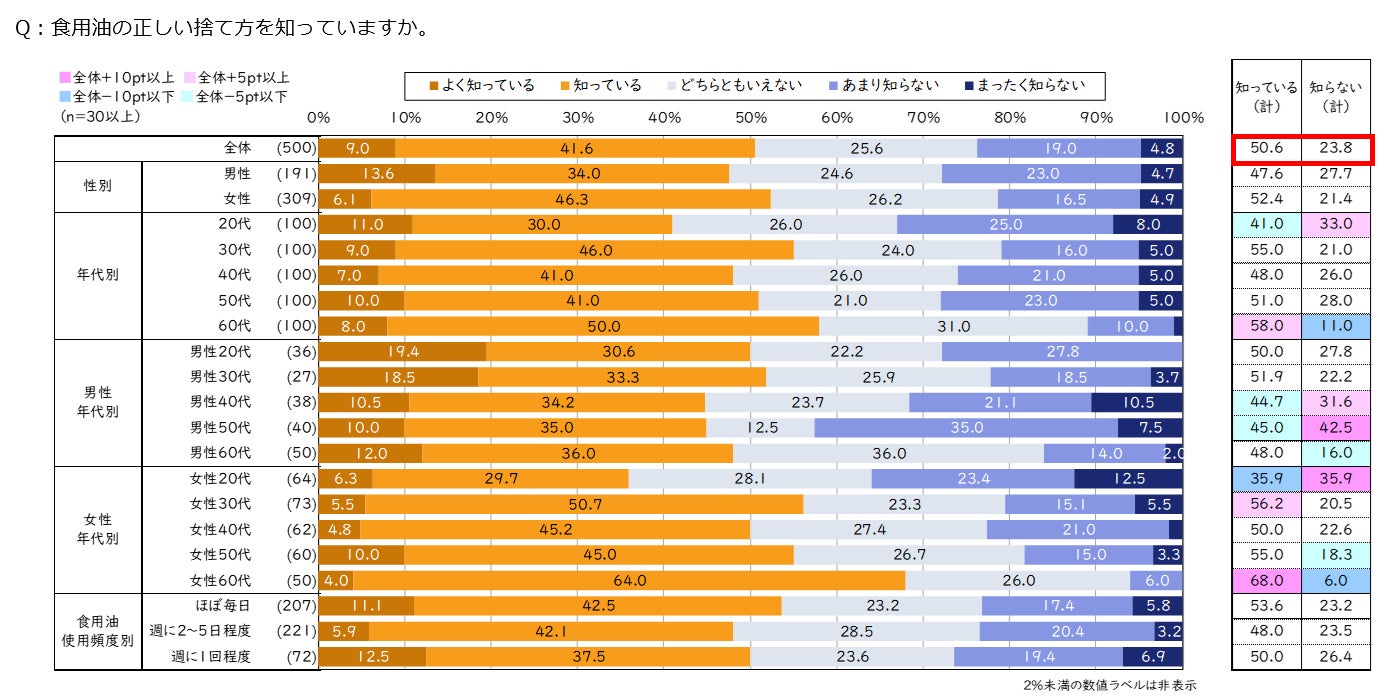 食用油の正しい捨て方を「知っている」割合は50.6%、「どちらともいえない」が25.6%、「知らない」が23.8%という結果になりました。