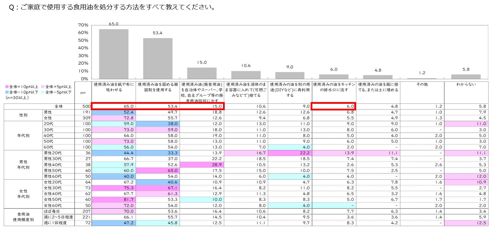 食用油の処分方法(複数回答)では、「使用済み油を紙や布に吸わせる」が65.0%と最も多く、次に「使用済み油を固める凝固剤を使用する」が53.4%でした。最近では廃食油の回収も知られるようになり、「廃食油回収に出す」が15.0%となりました。一方で、「使用済みの油をキッチンの排水口に流す」が6.0%と推奨されない方法での処分も見受けられました。