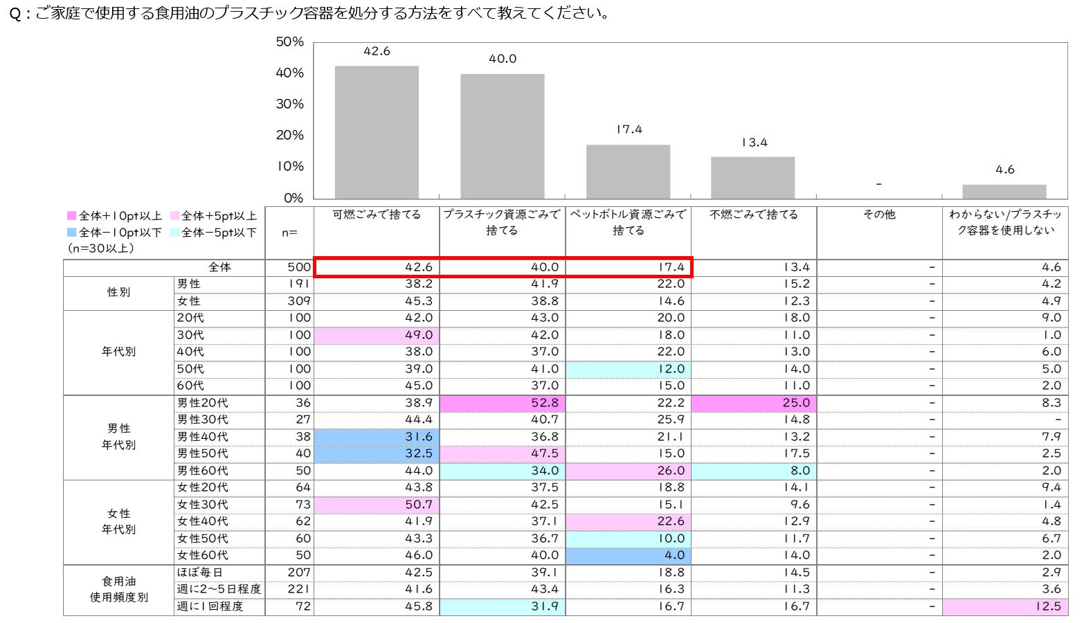 食用油のプラスチック容器の処分方法(複数回答)では、「可燃ごみで捨てる」が42.6%、「プラスチック資源ごみで捨てる」が40.0%となりました。「ペットボトル資源ごみで捨てる」が17.4%でしたが、油のついた容器はリサイクル対象の飲料などの容器とは異なり、ペットボトルの資源ごみとしては捨てられません。