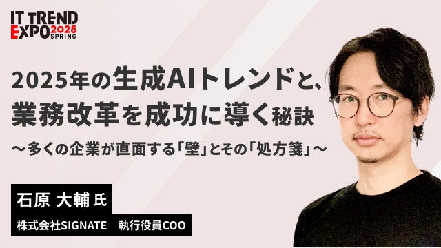 株式会社SIGNATE(本社:東京都港区、代表取締役社長:齊藤 秀、以下「SIGNATE」)は、2025年3月5日(水)〜7日(金)に開催される「ITトレンドEXPO2025 Spring」にて、執行役員COO 石原大輔がスポンサー講演を行うことをお知らせいたします。