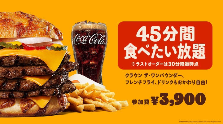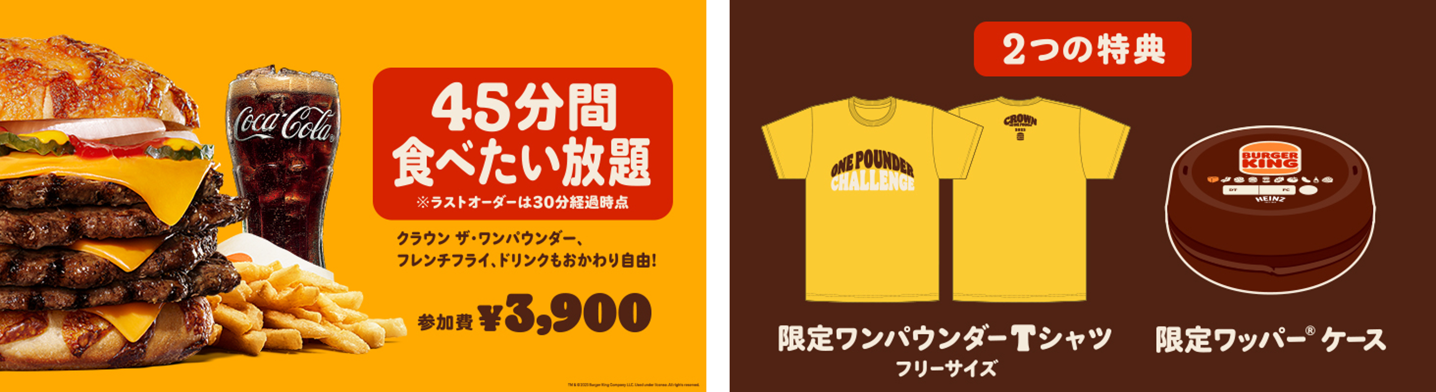 『クラウン ザ・ワンパウンダー』、フレンチフライ(M)、ドリンク(M)各商品を、それぞれ完食していることを条件に、いずれも制限時間45分以内でおかわり自由の食べたい放題イベントです。