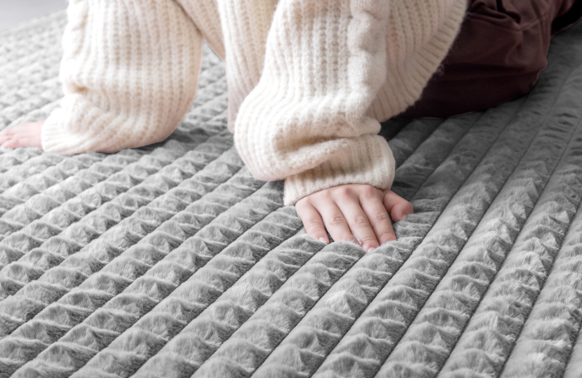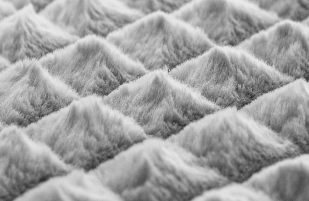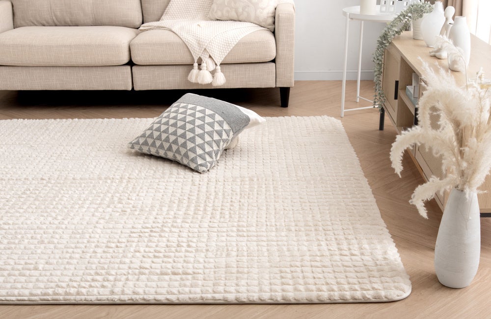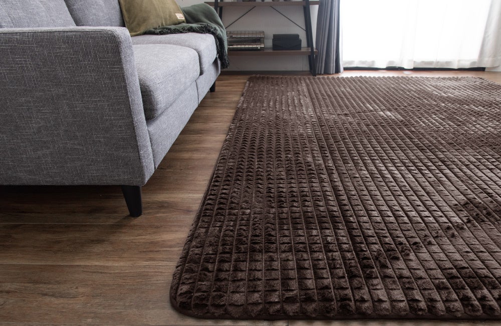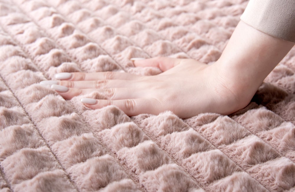 本製品はラビットファー調の毛足に立体感のあるデザインを施すことで、モコモコとした可愛らしい格子状のデザインになっております。インテリアに合わせやすいシンプルさを持ちながらも、個性的な見た目をしています。
