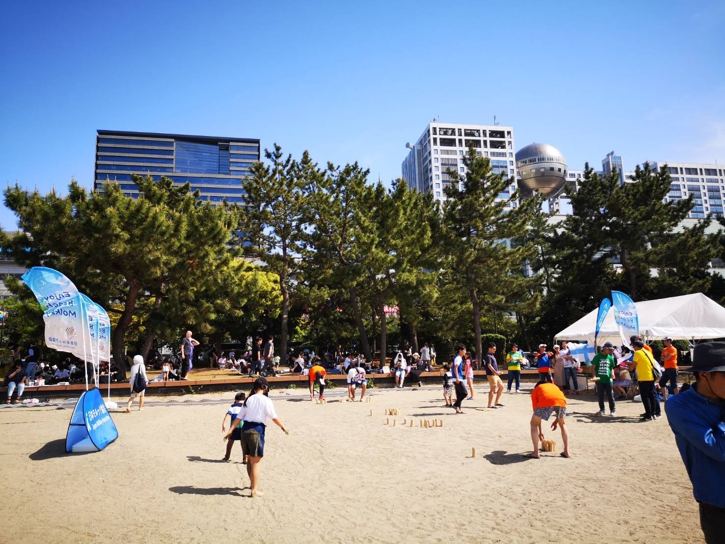 モルックは、1996年にフィンランドで考案。モルックと呼ばれる木製の棒を投げ、数字が書かれた木製のスキットルを倒し、倒れたスキットルの内容によって得点を加算。先に50点ちょうどを記録するチームを競うルールです。チーム競技であるため、メンバーと連携する必要があり、50点を獲得するための戦略も求められます。チームワークや協力性を発揮することで、より効果的なプレーを実現できるため、フレスコボールやビーチテニスと同様にコミュニケーションが重要に。性別や年齢に関係なく楽しむことができ、狙ったスキットルを倒す快感や、チームメンバーとの協力プレーの喜びなど、楽しみながら運動することがこのスポーツの魅力。そのモルックをビーチで行うのがビーチモルックです。