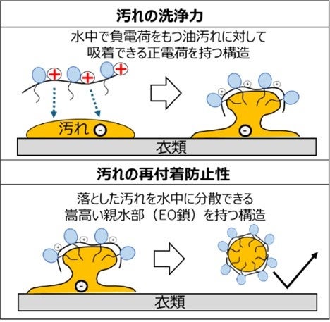 ポリエチレンイミンのエチレンオキシド付加体は水になじみやすい上に、カチオン部位という油汚れになじむ部分も持っていることから、効率よく汚れを取り除き、汚れの衣類への再付着を防止できると考えられます(図3)。