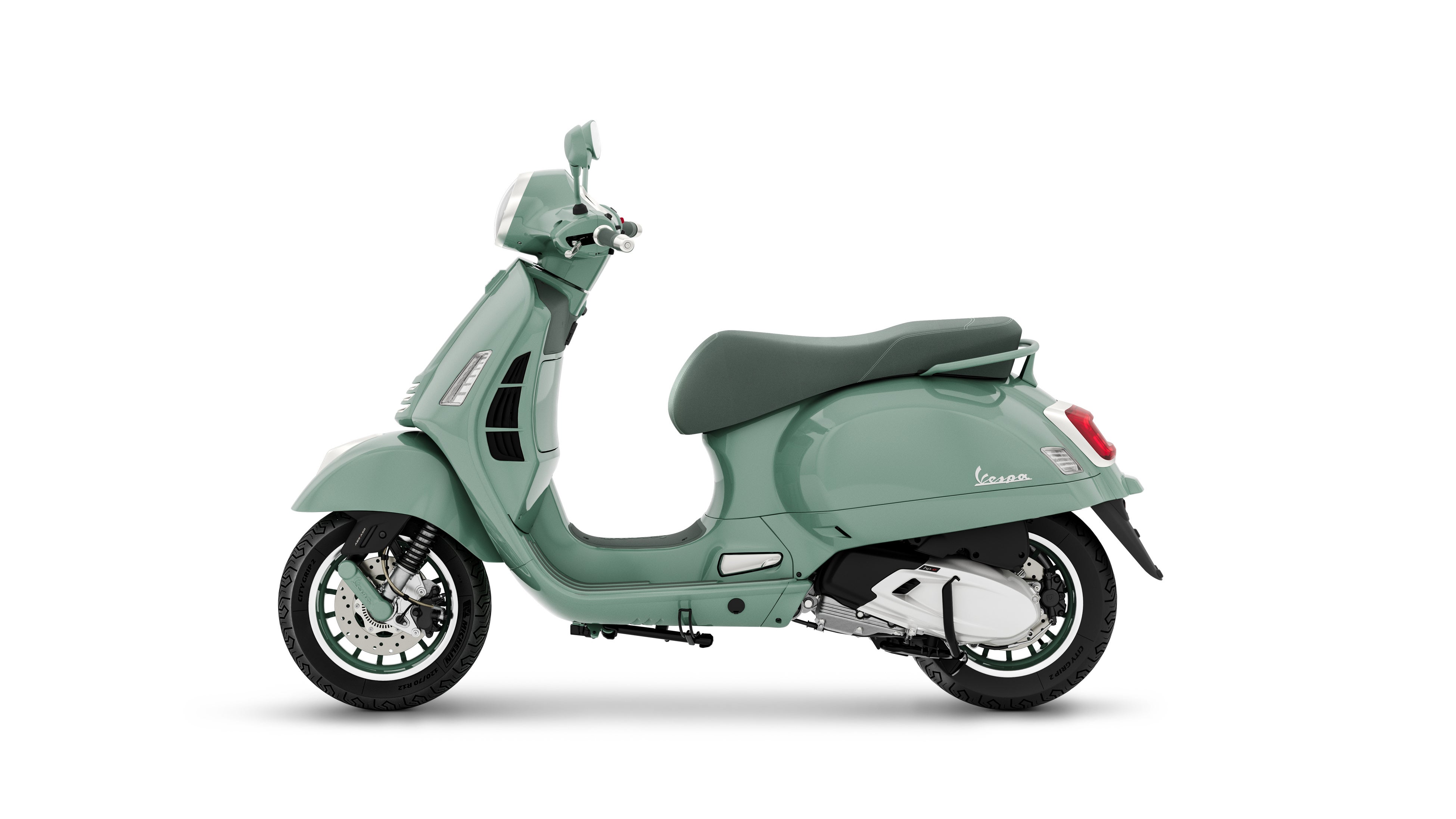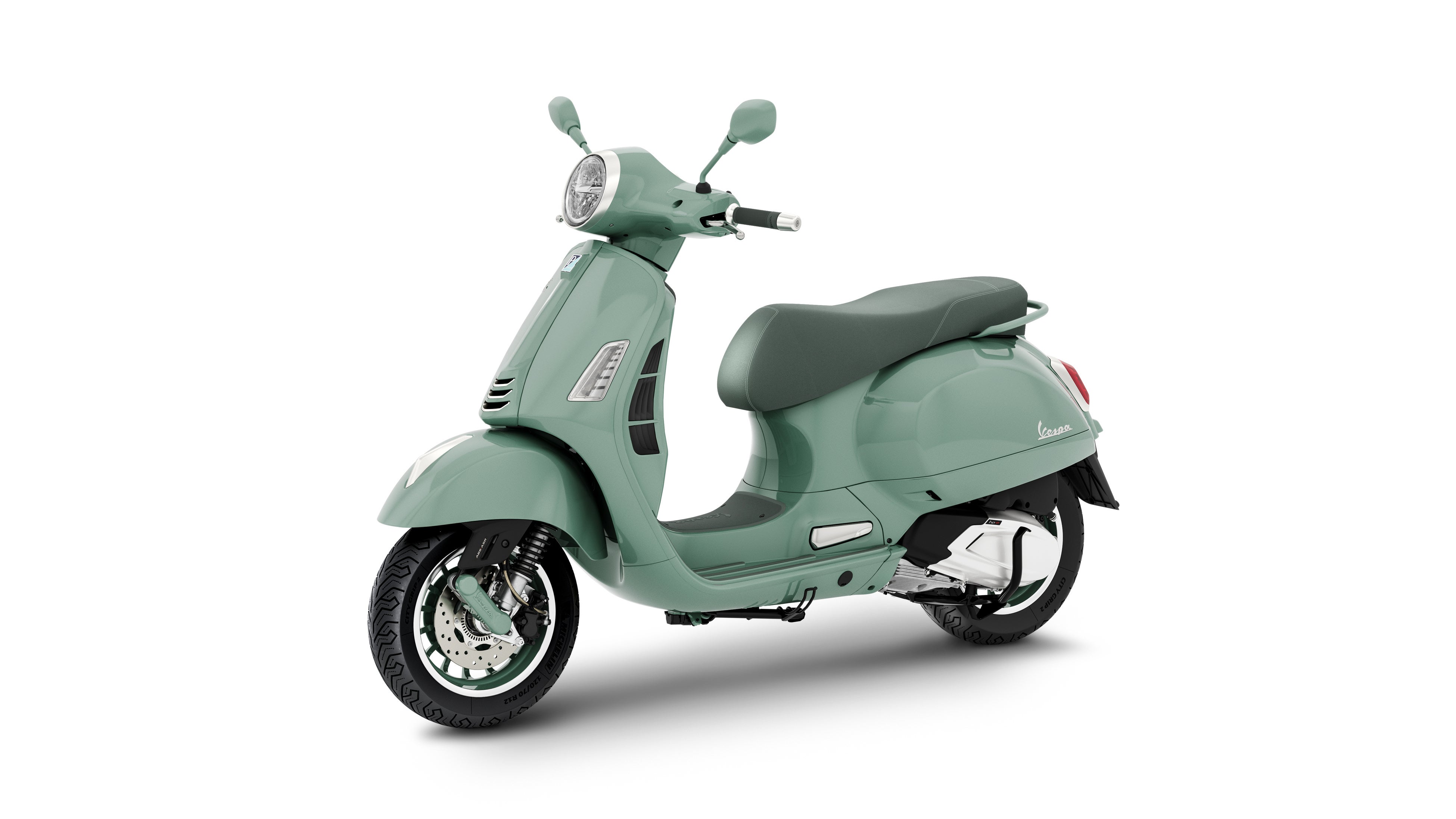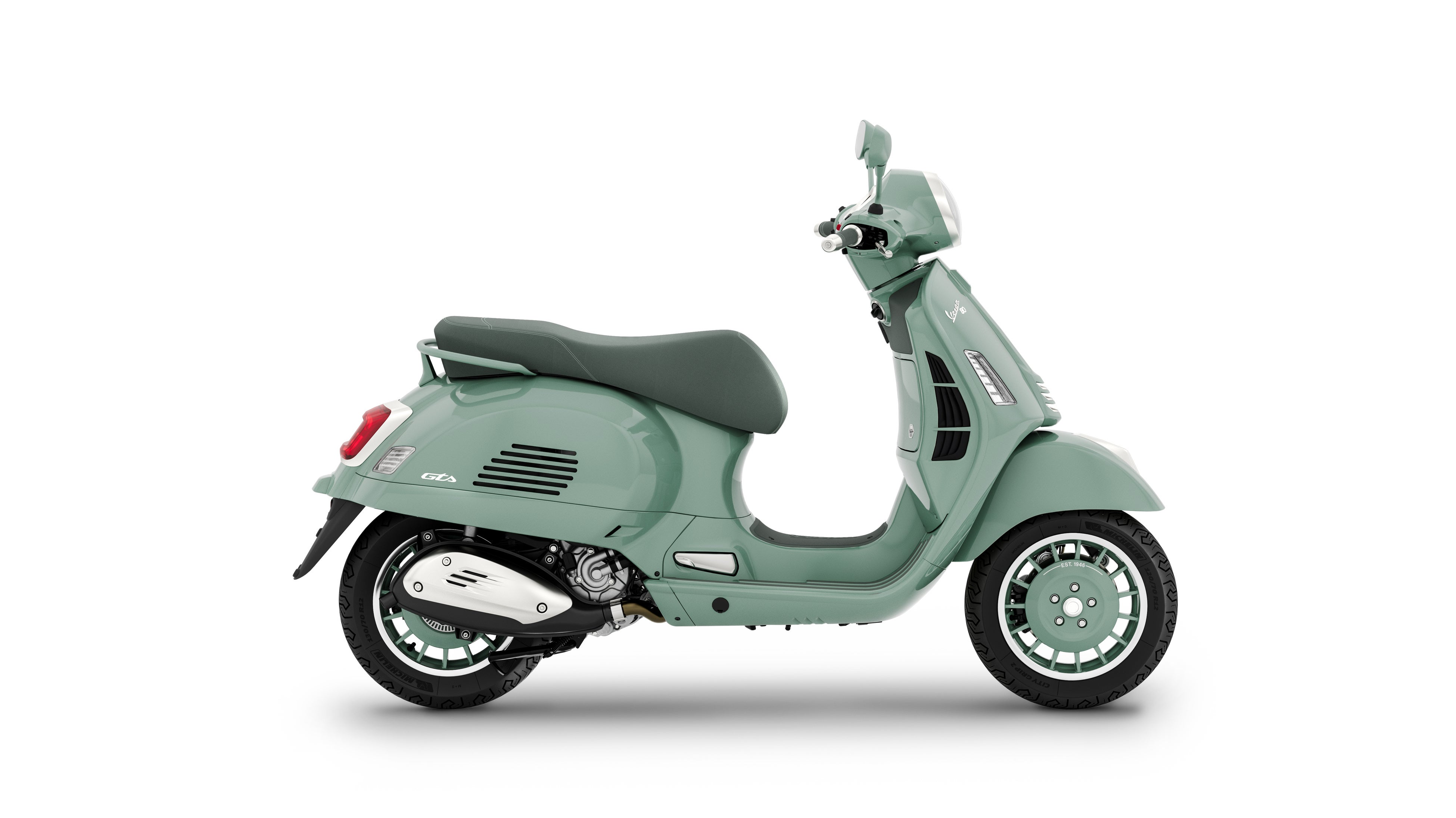 「Est. 1946」のグラフィックがさりげなく施されたホイールは専用品で、1946年のベスパ98から始まる初期のベスパからインスピレーションを得ています。こちらもパステルグリーンでペイントされ、当時のプレス成型されたスチールホイールの構造を彷彿とさせ、リム部分にはダイヤモンドカット仕上げが施されたデザインとなっています。