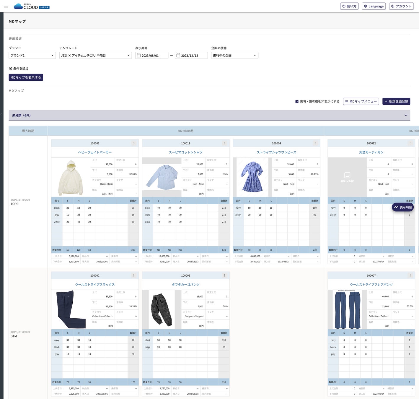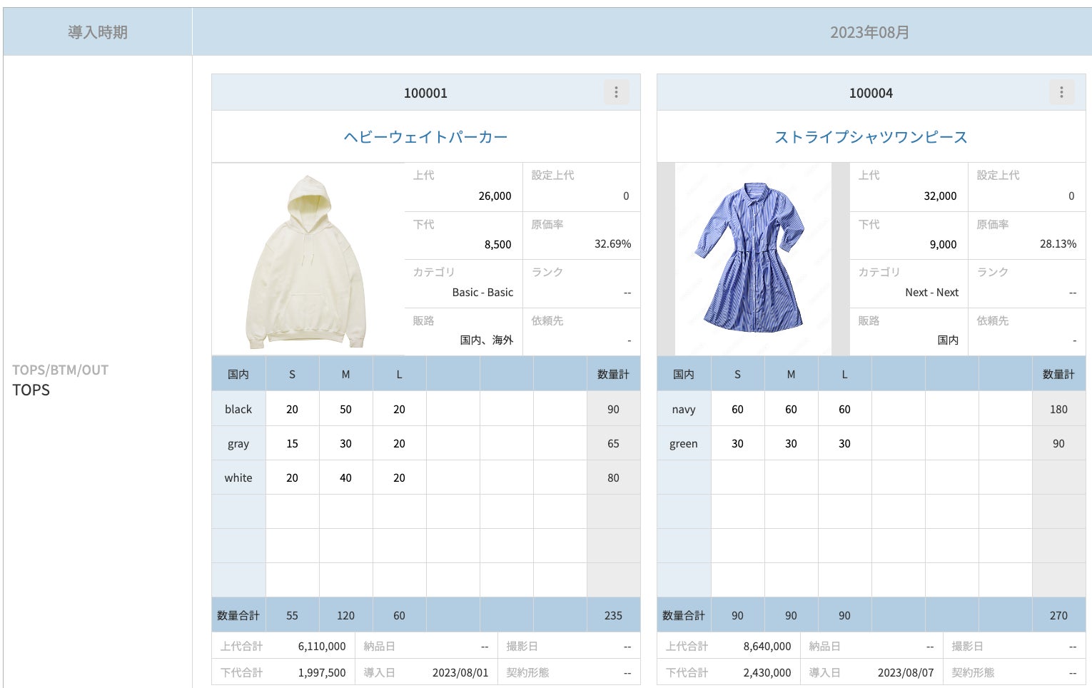 アイテムを細かく分類できるので、「納期×カテゴリー」「生地×カテゴリー」など軸を柔軟に切り替えることができます。これにより、様々な角度から分析したうえでの商品計画の作成が可能です。