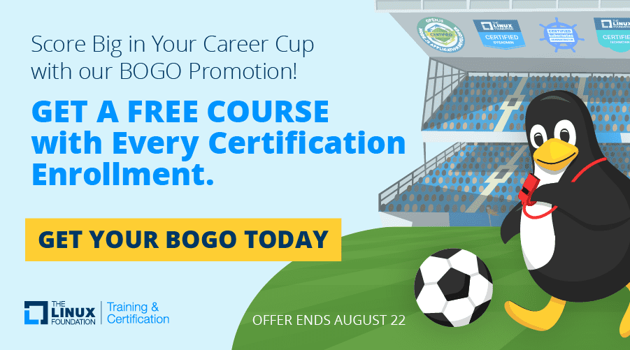 Linux Foundation Training & Certificationの8月のキャンペーンは、認定試験をを購入するとコンパニオントレーニングコースを無料で提供します。例えば認定Kubernetes管理者 (CKA-JP)を購入すると、Kubernetes基礎 (LFS258-JP) に追加料金なしでアクセスできます。