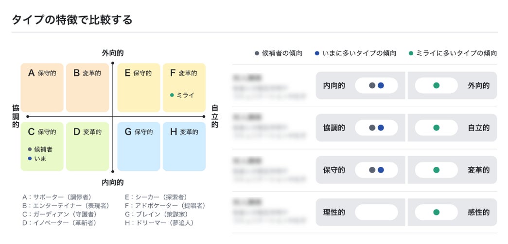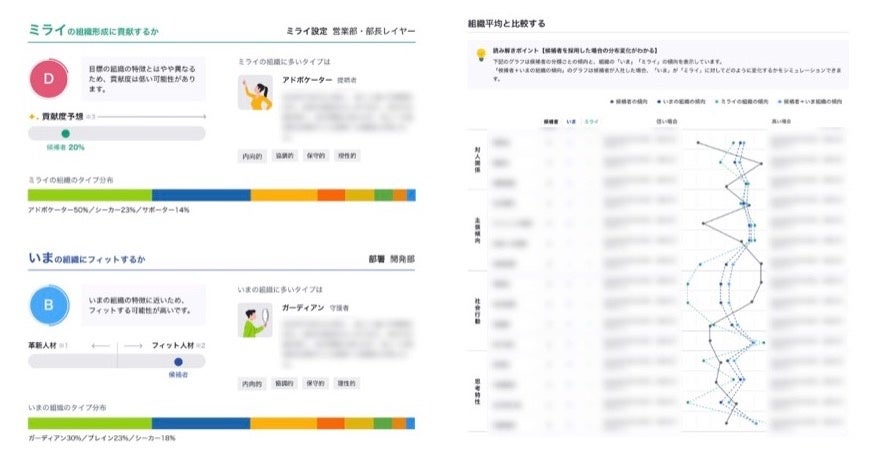 組織と人材のミスマッチを防ぎ、採用候補者の”いま”と”ミライ”の組織への貢献度がわかる適性検査サービスです。組織形成のために必要な人材タイプを組織サーベイ(ラフールサーベイ)で蓄積したビッグデータからAI解析し、組織と採用候補者の”いま”と”ミライ”のマッチ度、生産性の高い既存社員との類似度を比較可能です。