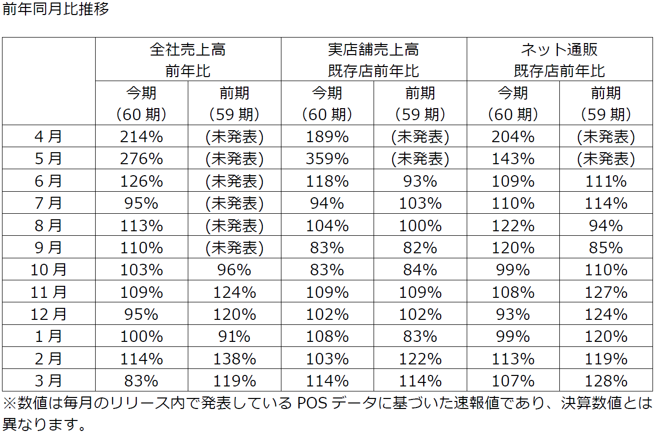 全社の前年比が100%を割っていますが、こちらは2021年4月配信の「2021 年 3 月期通期業績予想の修正に関するお知らせ」、2022年2月配信の「投資家の皆様へ――いただいたご質問への回答」でお伝えしているとおり、外商部門での新型コロナ関連の特需による影響が大きく、外商部門を除くと前年を上回っています。
