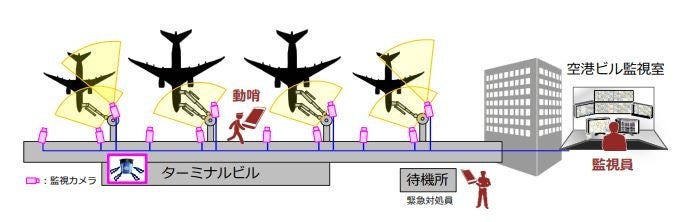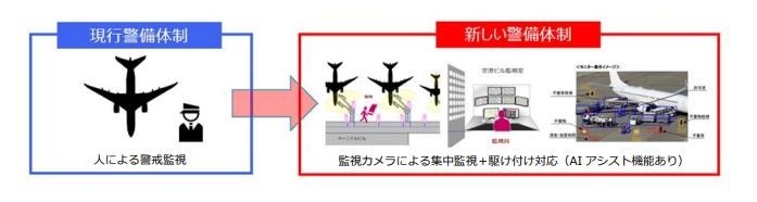 機側警備とは駐機する航空機に不審者 による 不正干渉を防止する業務をいいます。 今回の実証実験は、 監視カメラを用いた集中監視体制と、現場対応を組み合わせた警備体制とし、画像監視には AI 解析技術の 機能追加を持たせるものです。これにより、機側警備業務の高度化、効率化および省人化を図ることができ ます。