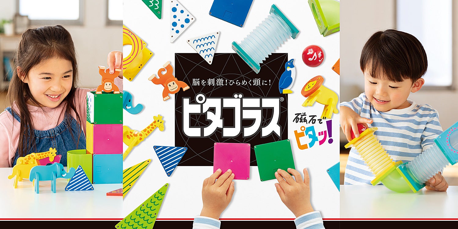 ピタゴラス®は不思議な磁石でピタッ!とくっつく知育玩具です。中学校の数学の先生が図形や立体を分かりやすく教えるためにつくった教材を、幼児や小学生にも楽しく使ってほしいという思いから生まれました。
