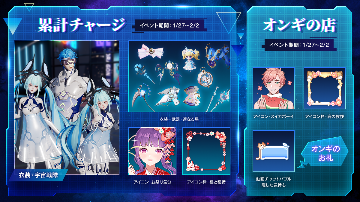 イベント期間中にチャージ額が一定額に達すると、ランクに応じて「冬の雪花チケット」とレアアイテムを獲得できます。「冬の雪花チケット」を使用することで、「衣装-武器·連なる星」、「衣装・宇宙戦隊」、「髪飾り・宇宙戦隊」、「アイコン・お祭り気分」、「アイコン枠・櫻と稲荷」などのアイテムと交換可能になります。
