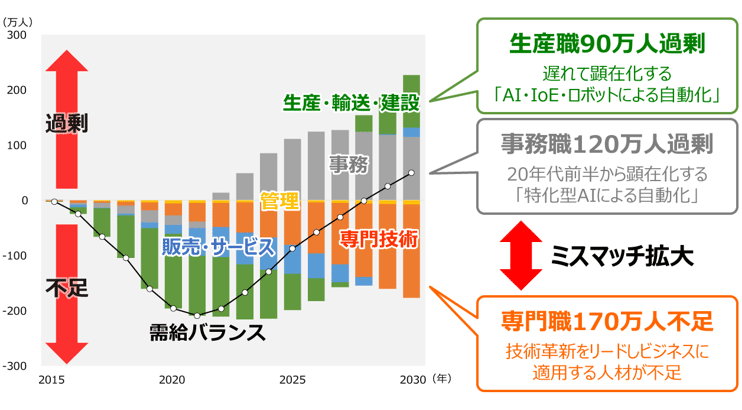 AIやロボティクスが台頭する“第4次産業革命”の中で、企業が求めるスキルは大きく変化しています。このような産業構造の変化によりスキルギャップが発生することで、これまで労働人口の多くを占めていた「生産職」や「事務職」が淘汰されていく一方で、デジタル人材をはじめとした専門技術人材は、2030年には170万人も不足していくと言われています。