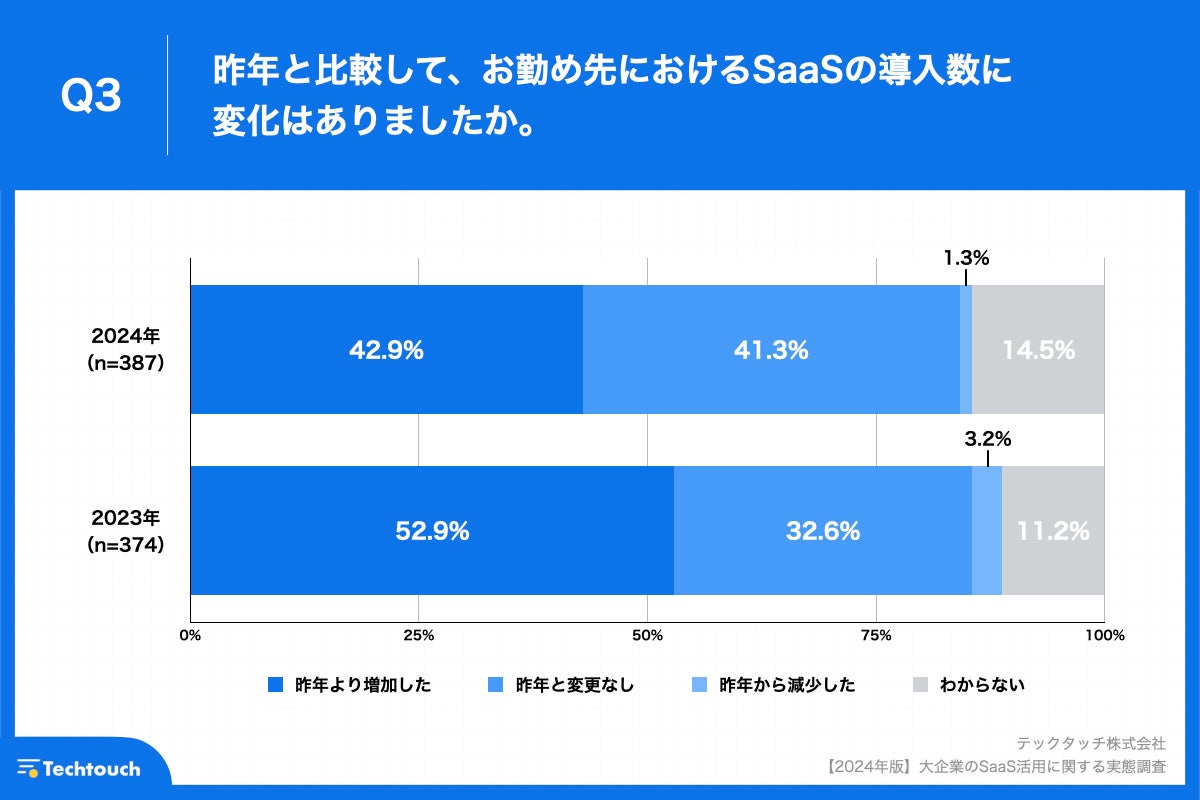 Q1で「はい」と回答した方に、「Q3.昨年と比較して、お勤め先におけるSaaSの導入数に変化はありましたか。」(n=387)と質問したところ、「昨年より増加した」(42.9%)、「昨年と変更なし」(41.3%)という回答となりました。(※5)