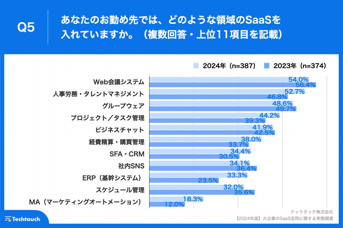 Q1で「はい」と回答した方に、「Q5.あなたのお勤め先では、どのような領域のSaaSを入れていますか。(複数回答)」(n=387)と質問したところ、「Web会議システム」(54.0%)が昨年同様トップに、2位以降は「人事労務・タレントマネジメント」(52.7%)、システムと「グループウェア」(48.6%)が入れ替わる結果となりました。