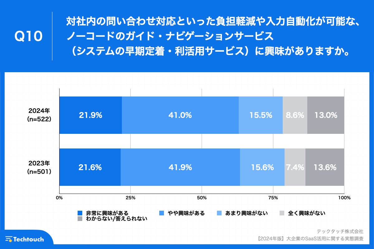 「Q10.対社内の問い合わせ対応といった負担軽減や入力自動化が可能な、ノーコードのガイド・ナビゲーションサービス(システムの早期定着・利活用サービス)に興味がありますか。」(n=522)と質問したところ、「非常に興味がある」(21.9%)、「やや興味がある」(41.0%)という回答となりました。
