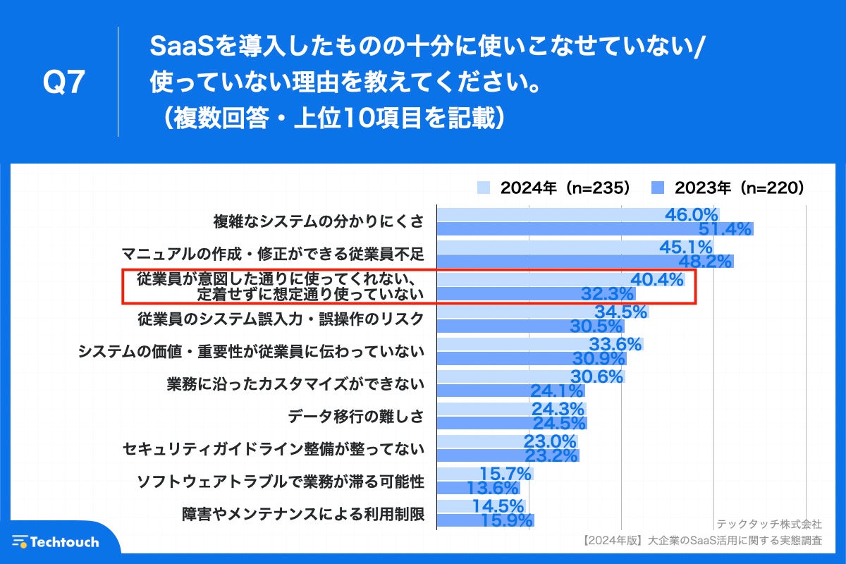 まず、SaaSを導入している大企業は74.1%で、2023年とほぼ同水準ですが、SaaSの種類に関しては、第1位「Web会議システム」(2023年比2.4P減)、第2位「人事労務・タレントマネジメント」(2023年比5.9P増)となり、2位以降が入れ替わる結果となりました。また、60.7%が「十分に使いこなせていないSaaSがある」と回答しており、2023年より1.9P増加しており、内訳を見ると「かなりある」の割合が3.0P増加していました。使いこなせない理由のトップは2023年と同様に「複雑なシステムの分かりにくさ」でしたが、「従業員が意図した通りに使ってくれない、定着せずに想定通り使っていない」の割合が昨対比で8.0Pも増加しており、これらのことから、SaaSの導入が進む中で、引き続き多くの大企業がその活用に苦慮している実態が明らかになりました。従業員のスキル向上とSaaSの有効活用を促進するためには、より効果的な施策が求められています。