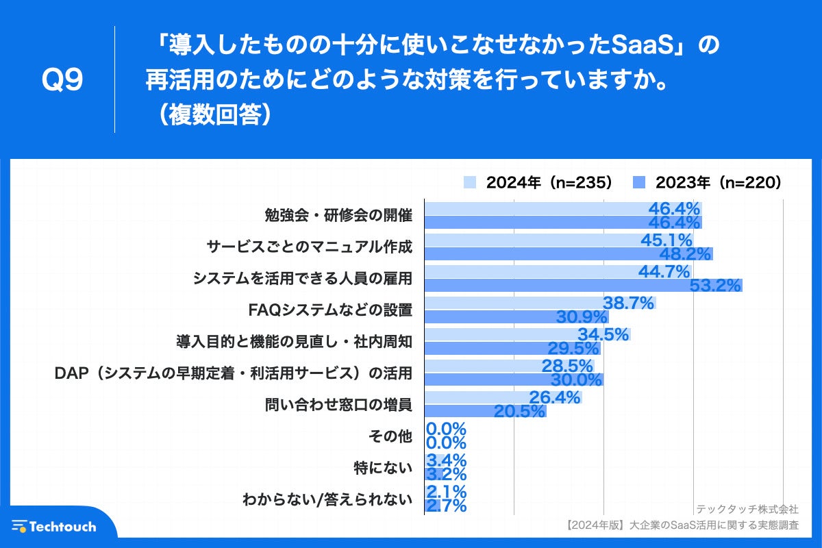 Q6で「かなりある」「ややある」と回答した方に、「Q9.「導入したものの十分に使いこなせなかったSaaS」の再活用のためにどのような対策を行っていますか。(複数回答)」(n=235)と質問したところ、「勉強会・研修会の開催」(46.4%)、「サービスごとのマニュアル作成」(45.1%)、「システムを活用できる人員の雇用」(44.7%)と、昨年同様の傾向となりました。