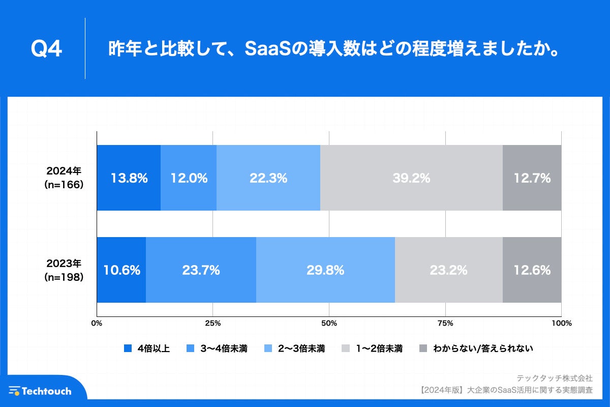 Q3で「昨年より増加した」と回答した方に、「Q4.昨年と比較して、SaaSの導入数はどの程度増えましたか。」(n=166)と質問したところ、「1~2倍未満」(39.2%)、「2~3倍未満」(22.3%)という回答となりました。(※6)