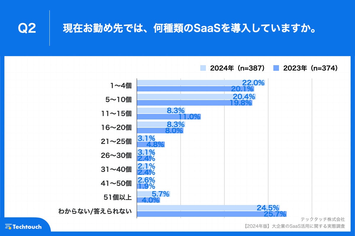 Q1で「はい」と回答した方に、「Q2.現在お勤め先では、何種類のSaaSを導入していますか。」(n=387)と質問したところ、「1~4個」(22.0%)、「5~10個」(20.4%)という回答となりました。