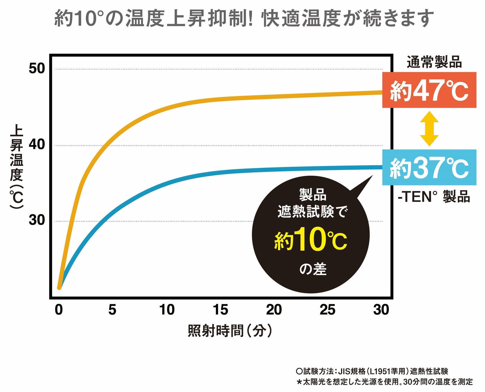 ※第三者機関による生地単体での遮熱試験結果(JIS L 1951)に基づく数値。実際の製品着用時は使用環境や個人差により体感温度が異なります。