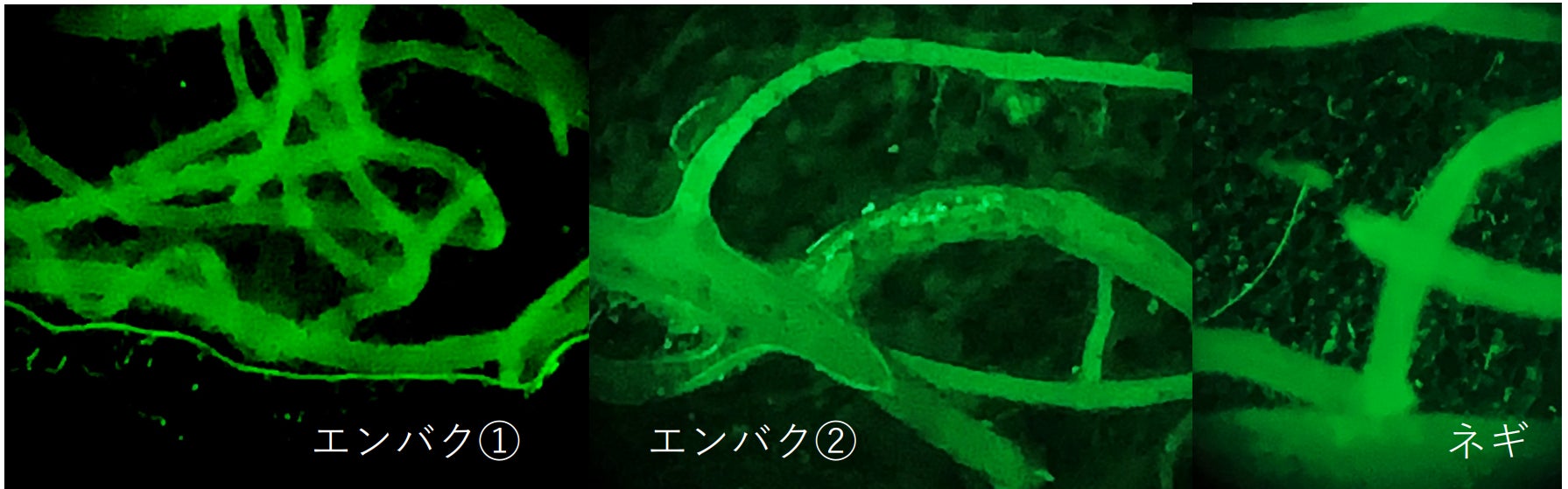 こちらは植物の根っこに共生している菌根菌やその胞子、菌糸のみを試薬で光らせた画像。画像左「エンバク①」はピッカピカ!その共生率はなんと77%もありました。この数字は、みんな大地が菌根菌調査を行った67カ所の畑のうちNo.1です(2025/5/10現在)。