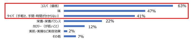 お弁当を手作りする上で重視していることについて、「コスパ」「味」「タイパ」を意識する人が多く、「栄養・栄養バランス」は4位という結果となりました。