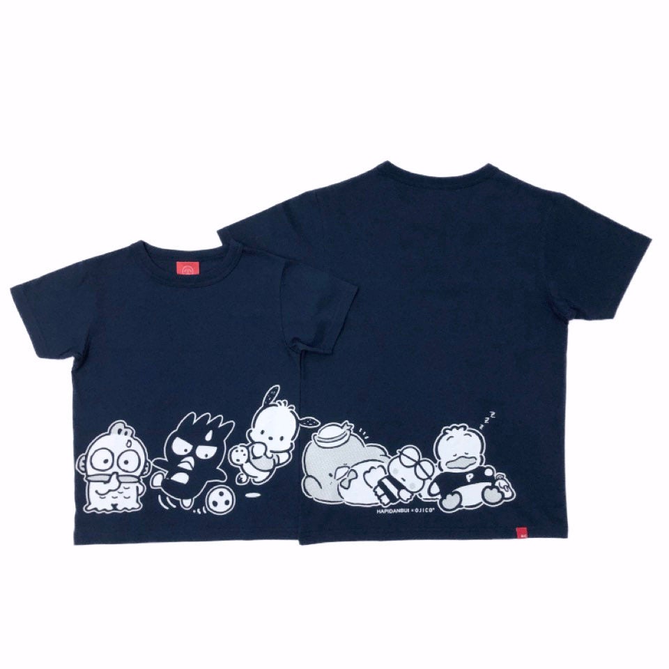 お昼寝中のタキシードサム、けろけろけろっぴ、あひるのペックルの横でサッカーをしてハンギョドンに注意されるバッドばつ丸とポチャッコの、ほのぼのとしたワンシーンを描いた「はぴだんぶい×OJICO」。