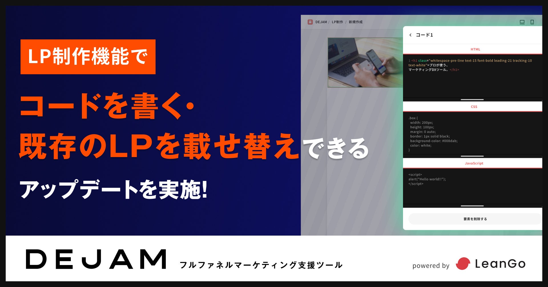 株式会社LeanGo (本社:東京都目黒区、代表取締役:平井 翔吏、以下 弊社) は、自社の運営するフルファネルマーケティング支援ツール「DEJAM( https://leango.co.jp/dejam/ )」がLP制作機能でコードを書く・既存のLPを載せ替えできるアップデートを実施したことをお知らせいたします。