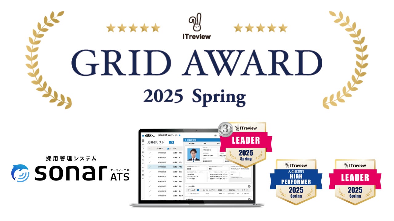 Thinkings株式会社(本社:東京都中央区、代表取締役社長:吉田 崇、以下:当社)が提供する「採用管理システムsonar ATS(https://hr.sonar-ats.jp/itreview_2025spring)」は、アイティクラウド株式会社(東京都港区、代表取締役社長 兼 CEO:黒野 源太)主催の「ITreview Grid Award 2025 spring」において、採用管理システム(ATS)部門で4期連続「Leader」を受賞しました。また、大企業部門の「High Performer」および中堅企業部門の「Leader」も受賞しました。これまでに、100件のレビューを頂いており(2025年4月時点)、認知度と顧客満足度の双方が優れた製品として評価されました。