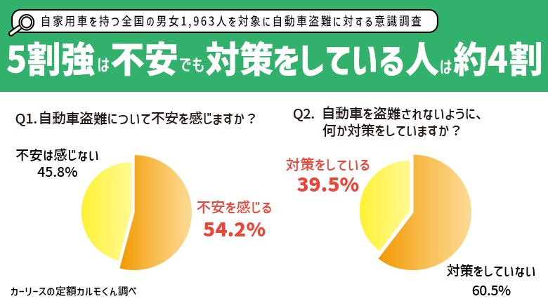 個人向けカーリースサービス「おトクにマイカー 定額カルモくん」(以下、定額カルモくん)を提供するナイル株式会社(本社:東京都品川区、代表取締役社長:高橋 飛翔)は、全国の男女1,963人を対象に、自動車盗難に対する意識についてインターネット調査を実施しましたので、調査結果をお知らせいたします。