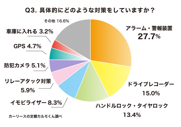 - 盗難対策は「アラーム・警報装置」「ドライブレコーダー」「ハンドルロック・タイヤロック」が上位
